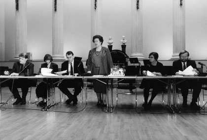 Osanottajat vasemmalta: professori Pertti Saariluoma, professori Tuula Gordon, professori Bo Pettersson, lehtori Seija Tiisala, dosentti Marja Häyrinen-Alestalo ja professori, vararehtori Ilkka Niiniluoto.