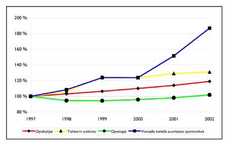 Kuvio 1. Muutoksia yliopistomaailmassa 1997–2002. Lähde: