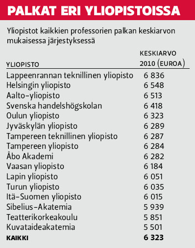 yliopistot on asetettu kaikkien professorien keskipalkan mukaiseen järjestykseen. Kärjessä on Lappeenrannan