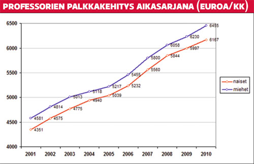 yliopistoissa miehet saavat 300—500 euroa enemmän kuin naiset. Naisten vaati- ja henki-tasot jäävät kaikissa