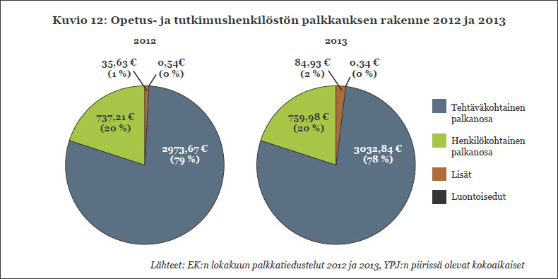 Yliopistohenkilöstön määrä väheneeSivistystyöantajat on julkaissut varsin monipuolisen selvityksen yliopistojen henkilöstöstä. Sen mukaan yliopistolaisten määrä vähenee, opetus- ja tutkimushenkilöstöstä on vakinaisessa työsuhteessa 28 prosenttia, mutta ansiokehitys on ollut kohtuullista. Kaikki yliopistot ja monet muut oppilaitokset ovat luovuttaneen neuvottelu- ja sopimusoikeutensa Sivistystyöantajille (Sivista). Sivista seuraa yliopistojen henkilöstöasioita ja raportoi niistä. Vähän aikaa sitten on ilmestynyt Tilastojulkaisu 2013, Yliopistot. Se on kokonaisuudessaan luettavissa Sivistan verkkosivuilta, www.sivistystyoantajat.fi. Tilastojulkaisu on lajissaan laajin ja monipuolisin. Kaikilta osin vastaavia tietoja ei ole aikaisemmin ollut käytössä. Henkilöstön ikäjakauma ja määräaikaisuus Yliopistohenkilöstön määrä on vähentynyt 1,7 prosentilla 2012—2013. Muun henkilöstön kohdalla vähennys on 2,7 ja opetus- ja tutkimushenkilöstössä 1,1 prosenttia. Yliopistojen välillä on melko isoja eroja: Aalto-yliopistossa henkilöstöä oli viime syksynä 5 prosenttia vähemmän kuin edellisenä vuonna, vastaavasti hankenilaisten määrä kasvoi 3 prosentilla. Opetus- ja tutkimushenkilöstön (= ”ope”) ikärakenne poikkeaa muista työpaikoista valtavasti. Syykin on selvä ja ilmeisen odotettu: tohtorikoulutetta vien suuri joukko, yli neljännes koko opetus- ja tutkimushenkilöstöstä, saa aikaan terävän piikin käyrässä. Sen sijaan esim. professorien ”suuret ikäluokat” eivät juuri tule esiin käyrässä. Muun henkilöstön (=”muhe”) ikäjakauma on hyvin tavanomainen muihin työpaikkoihin verrattuna. (Kuvio 1) Opetus- ja tutkimushenkilöstöstä vakinaisessa työsuhteessa oli 28 prosenttia ja muusta henkilöstöstä 78 prosenttia. Suuri vaikuttaja määräaikaisten suureen määrään ovat tutkijakoulutettavat, jotka käytännössä kaikki ovat määräaikaisia. Tämä ei ole kuitenkaan ainoa syy ”open” näinkin suuren määräaikaisuuteen. Kaikilla vaativuustasoilla ”open” alttius joutua määräaikaiseksi on suurempi kuin ”muhen”. Esimerkiksi ”open” ylimmillä vaativuustasoilla 8—11 määräaikaisia oli 28 prosenttia ja ”muhen” ylimmillä vaativuustasoilla 11—15 määräaikaisia oli 12 prosenttia. Nyt käytettävissä olevasta Sivistan julkaisusta ei näy yliopistokohtaiset erot määräaikaisuuksissa. Eroja on kuitenkin paljon. (Ks. esim. professorien osalta Acatiimi 3/2014: vaihteluväli professorien määräaikaisuuksissa oli tiedeyliopistoissa 7 prosentin ja 41 prosentin välillä. Taideyliopisto oli ihan oma lukunsa tässä suhteessa.) Palkkauksen rakenne ja ansiokehitys Muun henkilöstön kohdalla tehtävän vaativuusosa määrittää keskimäärin vajaata 80 prosenttia palkasta, suoriutumisosa 20 prosenttia ja lisät 2 prosenttia. Luontaisetuja ei käytännössä ole. (Kuvio 13) Henkikohtaiset palkkarakenne-eroavaisuudet voivat toki olla suuria. Jollakin suoriutumisosa voi olla noin 30 prosenttia kokonaispalkasta. Opetus- ja tutkimushenkilöstön palkkarakenne vastaa suunnilleen ”muhen” palkkarakennetta. ”Open” palkoissa on huomioitu Sivistan aikaisemmista tilastoista poiketen lisäelementtinä akateemisten johtajien palkkiot. (Kuvio 12) Yleinen ansiotasoindeksi nousi vuodesta 2012 vuoteen 2013 vajaalla 2 prosentilla. Eräillä EK:n aloilla korotus oli vielä pienempi. Yliopistojen ansiokehitys 2012—2013 on ollut suhteellisen hyvää. Sopimuskorotusten vaikutus on 1,9 prosenttia kaikilla. Tämän päälle on tullut noin yhden prosentin liukuma keskimääräisesti. Järjestelmäindenttisillä (=sama hetu ja sama palkkausjärjestelmä) korotus on ollut vielä selvästi tätä suurempi. (Kuvio 4) Kuviossa 4 ruskealla merkitty korotusosa johtuu tilastointimuutoksesta. Nyt on ensimmäisen kerran otettu ”opeilla” huomioon säännöllisen työajan ansiossa myös akateemisten johtajien (esim. dekaanit, laitosjohtajat) palkkiot. Tämä tilastointimuutos aiheuttaa ”opeille” n. 0,7 prosentin keskimääräisen näennäisen korotusvaikutuksen verrattuna vuoteen 2012. Akateemisten johtajien palkkiot kohdistuvat henkilöstöryhmistä valtaosin professoreihin. Kyse ei ole siis todellisesta muutoksesta, vaan professorit ovat aikaisemminkin saaneet akateemisten johtajien palkkioita. Professoreilla tilastointimuutos on aiheuttanut noin 2,3 prosentin näennäisen korotusvaikutuksen. Tilastointitavan muutos voi avata tietä väärinymmärtämisen mahdollisuudelle. Professoriliiton jäsenkyselyn mukaan jäsenten palkat nousivat oikeasti keskimäärin 2,9 prosenttia vuodessa, mikä sinänsä on hyvin tyydyttävä palkkakehitys. teksti Jorma Virkkala