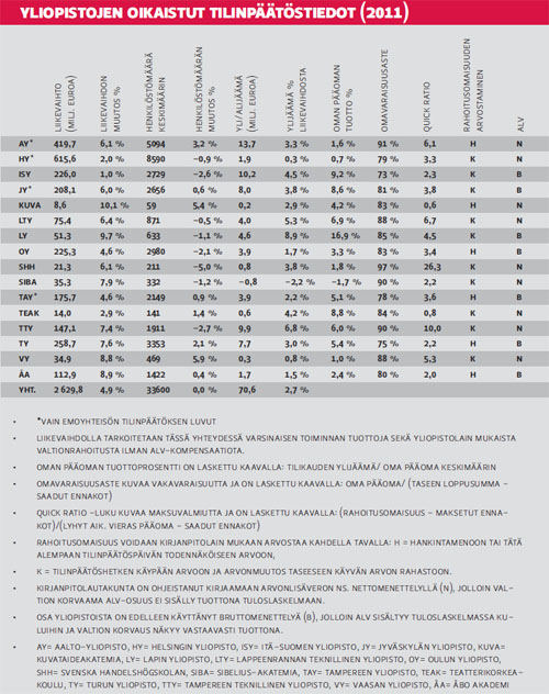 kuvan yliopistojen tilivuoden 2011 tuloksista ja