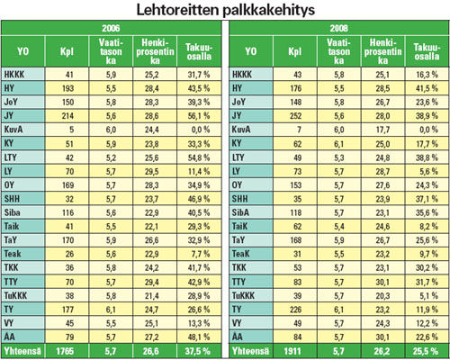 Lehtoreiden palkkaliukuma lähinnä henkitason nousuaLehtoreiden palkkasumma on kasvanut kahden vuoden aikana yleiskorotusten lisäksi kahden prosentin verran. Tilastot osoittavat, että liukuma on tapahtunut lähinnä hienoisena henki-tason nousuna. Vaatitasojen keskiarvo on säilynyt melkein samana eli on ollut 5,7. Takuupalkkaisten määrissä on suuria eroja yliopistojen välillä. Voimassa olevan yliopistojen tarkentavan virkaehtosopimuksen mukaan palkkauksen kehittymistä seurataan eri henkilöstöryhmien osalta henkilöstöjärjestöjen ja työnantajajärjestön yhteistyönä. Tilastojen saamisessa on ollut suuria ongelmia sen vuoksi, että koko valtiosektorilla käyttöön otettavaksi suunniteltu ns. Tahti-järjestelmää ei ole saatu toimimaan. Yliopistot ovatkin joutuneet kokoamaan tiedot itse ja toimittamaan ne opetusministeriölle. Nyt palkkatilastojen yhteenveto on edennyt siihen vaiheeseen, että johtopäätöksiä on tehtävissä. OAJ:ssä on tehty laskelmia lehtoreitten palkkauksesta. Laskelmien mukaan lehtoreitten palkkaustasossa on tapahtunut sopimuskorotusten päälle liukumaa n. 2 prosenttia UPJ-aikana kesästä 2006 maaliskuuhun 2008. Tämä tarkoittaa sitä, että tarkasteltaessa yksilöittäin palkkauksen kehittymistä palkkasumma on ao. aikana kasvanut yleiskorotusten lisäksi kahden prosentin verran. Esimerkin vuoksi todettakoon, että samaan aikaan yliopistonlehtori-nimikkeellä palkkaliukuma on ollut 1,6 prosenttia, kliinisten opettajien 3 prosenttia ja päätoimisten tuntiopettajien 1,2 prosenttia, professoreitten 1,8 ja tutkijoitten 3,7 prosenttia. Kaiken kaikkiaan tilastoista on nähtävissä, että palkkauksen liukuma on tapahtunut lähinnä hienoisena henki-tason nousuna. Vaati-tasojen keskiarvo on säilynyt kesästä 2006 maaliskuuhun 2008 melko tarkkaan samana eli on ollut 5,7. Erityisesti lehtoreitten palkkarakenteessa ns. takuupalkkojen ja lehtorilisien osuus korostuu. Niiden avullahan turvattiin se, ettei palkka uuden järjestelmän myötä laskenut. Poistuneista 294 lehtorista 92 on ollut takuupalkalla. Samaan aikaan seitsemän takuupalkkaista päätoimista tuntiopettajaa, 8 takuupalkkaista yliopistonopettajaa ja 14 takuupalkkaista yliopistonlehtoria on siirtynyt pois yliopistojen palveluksesta. Takuupalkkaisten määrissä on suuria eroja yliopistojen välillä. Seuraavasta taulukosta on havaittavissa, että vieläkin joissain yliopistoissa takuupalkkaisten lehtoreitten määrä on 40 prosentissa. (Ks. taulukko) Verrattaessa yliopistoista eläköitymisen tai muun syyn vuoksi pois lähteneitten palkkausta heidän tilalleen tulleitten palkkaan, voidaan havaita, että lehtoriryhmässä palkkarahat ovat liukumien vuoksi säilyneet, hieman lisääntyneetkin. Palkkaliukuma on ollut suurempaa kuin mitä poistuneiden takuuosat ja lehtorilisät. Tämä on erittäin tärkeää palkkausjärjestelmän uskottavuuden kannalta. Kun seuraavista kehittämisrahoista neuvotellaan, on päästävä kuitenkin siihen, että palkkaus myös kehittyy. Se voi tapahtua vain oikeudenmukaisesti toteutetun palkkausjärjestelmän soveltamisen kautta. Tässä suhteessa joudutaan valitettavasti osassa yliopistoista vielä paljon parantamaan toimintatapoja. Tuula Hirvonen