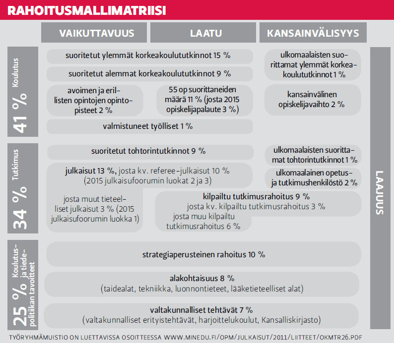Rahoitusmalli siirtää fokuksen tavoitteista tuloksiinTutkintotavoitteet eivät enää vuodesta 2013 lähtien määrittele yliopistojen rahoitusta. Jatkossa niiden rahoitus määräytyy pitkälti tutkintomäärien ja julkaisujen perusteella. Maisteritutkinto on yliopistojen perustutkinto, joten sen painoarvo on suurempi kuin alempien tutkintojen. Mallin koulutusosiossa on mittareita, joilla tähdätään opintojen vauhdittamiseen: 55 opintopistettä suorittaneiden määrä on rahoituskriteeri. Opiskelijapalaute aiotaan ottaa mukaan vuodesta 2015, kun YOPALA-palautejärjestelmä valmistuu. Valmistuneiden laadullinen työllistyminen on mukana prosentin osuudella. Yhden prosentin painoarvo mallissa on kuitenkin aika suuri, 15—20 miljoonaa euroa. Tieteellisten seurain valtuuskunta on toteuttanut opetus- ja kulttuuriministeriön rahoituksella Julkaisufoorumi-hanketta, jonka tavoitteena on luoda laatuluokitus tieteellisen julkaisemisen kanaville. Luokitus valmistuu tämän vuoden loppuun mennessä. Sitä ei voida hyödyntää vielä seuraavan rahoituskauden alussa, mutta se aiotaan ottaa käyttöön 2015. Kansainvälistyminen huomioidaan mallissa selvästi aiempaa vahvemmin. Ulkomaalaisten suorittamien tutkintojen ja opiskelijaliikkuvuuden ohella rahoitusmallissa on kriteerinä ulkomaalaisen opetus- ja tutkimushenkilöstön määrä. (ks. pääkirjoitus.) Korkeakoulujen ja tiedelaitosten johdon seminaarissa 21.11. rahoitusmallia esittelyt johtaja Anita Lehikoinen opetus- ja kulttuuriministeriöstä kertoi olleensa hieman yllättynyt siitä, että monet tahot halusivat uuteenkin malliin strategiarahaa. Sillä aiotaan ohjata mm. yliopistojen profiloitumista. Rahoitusmalli on verkkopohjaisella lausuntokierroksella viikoilla 47— 50. Valmiiksi se aiotaan saada ensi vuoden alussa. Mallia seminaarissa kommentoinut Suomen yliopistot UNIFIn puheenjohtaja, Oulun yliopiston rehtori Lauri Lajunen ei oikein löytänyt siitä moitteen sijaa. Työryhmässä olikin vahva yliopistojohdon edustus. — Mallia suurempi huoli on se, mikä on kehys ja kuinka paljon on jaettavaa, Lajunen totesi ja toivoi, että opetusministeri pitää puolensa kehysratkaisuissa. SYL:n puheenjohtaja Katri Korolainen-Virkajärvi piti rahoitusmallin valmistelua hieman paavillisena ja kyseenalaisti valmisteluprosessin demokraattisuutta. 55 opintopisteen suorittaneiden ottamisessa laatukriteeriksi hän näki valtiovarainministeriön vaateet. — Toivottavasti tämä ei tee yliopistoista banaanivaltioita eikä johda riman laskuun ja tutkintotehtailuun, hän tähdensi. Kirsti Sintonen