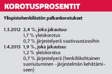 Yliopistosektori pääsi raamiinYliopistosektorilla päästiin viime metreillä raamisopimuksen mukaiseen neuvottelutulokseen. Yliopistojen yleisen työehtosopimuksen uudistamista koskeva allekirjoituspöytäkirja signeerattiin henkilöstöjärjestöjen (JUKO, Pardia, JHL) ja yliopistotyönantajaa edustavan Sivistystyönantajien välillä 24. marraskuuta. Tes-neuvottelutulos raukeaa, mikäli raamisopimus ei ole riittävän kattava.Tämä oli vielä lehden painoon mennessä auki. Yliopistojen työehtosopimus on voimassa 1.3.2012 - 31.3.2014. Yliopistohenkilöstölle tulee yleisen raamin mukaiset korotukset. 1.3.2012 alkaen yhteensä 2,4 prosenttia, joka jakautuu prosentin yleiskorotukseen ja 0,7 prosentin järjestelyerään vaativuustasoihin. Seuraavana vuonna tulee 1.4.2013 alkaen yhteensä 1,9 prosentin korotus, joka jakautuu 1,2 prosentin yleiskorotukseen sekä 0,7 prosentin järjestelyerään. Tämä järjestelyerä kohdistetaan palkkausjärjestelmän henkilökohtaisen suoriutumisen osuuteen. Kevään 2013 järjestelyerässä on ns. perälauta: eli jos sen kohdentamisesta ei päästä yhteisymmärrykseen, 0,3 prosenttia jaetaan yleiskorotuksena ja 0,4 prosenttia työnantajakohtaisesti henkilökohtaisten palkkojen korotuksiin. Raamisopimuksen mukaisiin neuvottelutuloksiin sisältyy myös kertaerä. Yliopistoissa tämä 150 euron suuruinen kertaerä maksetaan 1.4.2012 alkavan palkanmaksun yhteydessä. Erän maksamisen edellytyksenä on, että työsuhde on alkanut viimeistään 2.1.2012 ja on ollut keskeytyksettä voimassa 31.3.2012 asti ja että henkilölle maksetaan palkkaa huhtikuussa 2012. Akatemiaprofessorit ja -tutkijat saavat vastaavat korotukset: 1.3.2012 2,4 prosenttia ja 1.4.2013 1,9 prosenttia sekä 150 euron kertaerä 1.4.2012. Lisäksi yliopistoneuvotteluissa tehtiin työehtosopimukseen joitakin tekstimuutoksia. Väitöskirjaa päätyönään tekevien henkilöiden osalta suositellaan, että heidän tehtävänsä tulisi pääsääntöisesti sijoittaa ensimmäisen työsuhteen alussa vaativuustasolle 2. Väitöskirjaa päätyönään tekevien henkilöiden eteneminen vaativuustasolta toiselle voidaan toteuttaa ilman palkkausjärjestelmän mukaista vaativuusarviointia ja arviointiryhmän käsittelyä, jos yliopistossa on määritelty eteneminen vaativuustasoilla. Soveltamisohjeen mukaan väitöskirjan tekijöiden opetustuntien määrä on ollut 56 tuntia lukuvuodessa. Nyt tästä saatiin uusi ohjeistus: suositeltavaa on, että opetukseen käytetään enintään 5 % vuosityöajasta, ja että opetus mahdollisuuksien mukaan liittyy henkilön omaan tutkimukseen. Post doc -vaiheessa oleva tutkijatohtori sijoittuu vaativuustasolle 5, kun väittelystä on enintään 3 vuotta. Tässäkään ei edellytetä arviointiryhmän käsittelyä, mutta mahdollisuus sinne viemiseen on. Neuvottelutulokseen sisältyy palkkausjärjestelmän henkilökohtaisen suoriutumisosion kehittämiseen liittyviä periaatteita. Tästä neuvotellaan 31.5.2012 mennessä ja periaatteiden tulisi olla voimassa kevään 2013 arvioinneissa. Kenenkään palkka tai henkiosa ei voi laskea uudistuksen seurauksena. Työkykyä ylläpitävä kuntoutus (esim. Aslak) tulee palkalliseksi. Lisäksi tehtiin tarkennuksia teksteihin, jotka koskevat työaikana tapahtuvia lääkärissäkäyntejä ja lääkärintarkistuksia.