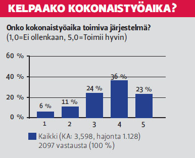 Kokonaistyöajasta ei haluta vaihtaa toimistotyöaikaanKokonaistyöajan toimivuudesta on tehty kysely. Vastaajien enemmistö pitää sitä opetus- ja tutkimushenkilöstölle sopivana järjestelmänä. Työsuunnitelmiin liittyy puutteita. Yliopistojen kokonaistyöaikasopimuksen soveltamisala laajeni vuonna 2010 käsittämään koko opetus- ja tutkimushenkilöstön. Nyt, kun sopimus on ollut voimassa noin 2,5 vuotta, voi jo arvioida sen toimivuutta. Lyhyissä määräaikaisissa palvelussuhteissa olevien nuorempien tutkijoiden ja tohtorikoulutettavien osalta epäkohtina on huomattu vuosilomaa vastaavien vapaiden pitämättä jääminen ja äitiys- ja perhevapaiden huomioon ottaminen työsuunnitelmia tehtäessä. Kymmenen akavalaista liittoa, mukaan lukien Tieteentekijöiden liitto, teettivät jäsenistölleen lokakuussa 2012 yliopistojen kokonaistyöaikaa ja sen toimivuutta koskevan kyselyn. Kysely lähetettiin nettikyselynä liittojen yliopistoissa työskenteleville jäsenille. Kyselyn käytännön järjestelyistä ja tulosten analysoinnista vastasi Luonnontieteiden Akateemisten Liitto LAL. Kyselyyn tuli 2097 vastausta, vastanneista 37 prosenttia oli Tieteentekijöiden liiton jäseniä. Alun perin kyselyssä oli tarkoitus kartoittaa nuoremman tutkijankunnan käsityksiä kokonaistyöaikasopimuksen toimivuudesta, mutta kysely osoitettiin myös muulle opetus- ja tutkimushenkilöstölle. Vastanneista 74 prosenttia oli määräaikaisessa palvelussuhteessa ja 30 prosenttia vastanneista oli tohtorikoulutettava/ tutkijakoulutettava/nuorempi tutkija/ tohtoriopiskelija -nimikkeellä.