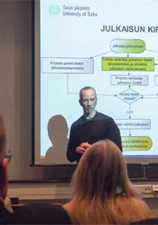 Avoin tiede puhutti Informaatioalan Akateemisten syysseminaarissaAvoin tiede, hyvä mieli -seminaarin teemoja olivat open access ja julkaisutietojen tallentaminen. Informaatioalan Akateemiset ry:n syysseminaari pidettiin jo perinteeksi muodostuneeseen tapaan Helsingin Kirjamessujen yhteydessä perjantaina 24. lokakuuta. Tämän vuoden teemoja olivat open access sekä julkaisutietojen tallentaminen ja hallinta. Seminaarin aluksi Vasemmistoliiton puheenjohtaja ja kansanedustaja Paavo Arhinmäki otti puheenvuorossaan kantaa tieteen arvostuksen puolesta ja korosti tutkimuksen tuoman tiedon merkitystä poliittisessa päätöksenteossa. Open access – kohti avointa tiedettä Tutkija Yrsa Neuman puhui tutkimusmateriaalien avoimesta saatavuudesta tutkijoiden, julkaisufoorumien ja rinnakkaistallennukseen liittyvien käytäntöjen näkökulmista. Neuman on filosofi ja tutkii open accessia Åbo Akademissa. Avoimen tieteen tavoitteena on mahdollistaa tutkimuksista saadun tiedon laajempi leviäminen ja tulosten vertailu, sekä edesauttaa tiedeyhteisön sisällä käytävää keskustelua. Yksi avoimen tieteen sisältämistä käytännöistä on tutkimusjulkaisujen avoimen saatavuuden, eli open accessin edistäminen Yhtä suurempi osa tutkimuksista julkaistaan ainakin jossain muodossa open accessina, mutta Neumanin mukaan julkaisutavoissa ja -käytännöissä on merkittäviäkin alakohtaisia eroja. Julkaisutavan valintaan vaikuttavat monet tekijät, kuten julkaisufoorumin tunnettuus, tutkimuksen aihe ja odotettavissa oleva julkaisuaika. Näiden tärkeysjärjestys vaihtelee tieteenalojen mukaan. kirjasto tutkijan tukena Informaatikko Marja-Leena Harjuniemi ja tieteenalakirjaston päällikkö Jukka Rantasaari käsittelivät kumpikin puheenvuoroissaan julkaisutietojen tallentamista ja hallintaa. Harjuniemi esitteli Jyväskylän yliopistossa keväällä 2014 aloitettua käytäntöä, jossa julkaisurekisterin ylläpitäminen on keskitetty kokonaan laitoksilta kirjastolle. Uudistuksen taustalla on pyrkimys paitsi tutkijan arjen helpottamiseen ja kirjausten laadun parantamiseen, myös rinnakkaistallentamisen lisäämiseen. Tutkijan vastuulle jää ainoastaan tutkimuksen ilmoittaminen kirjastolle. Jyväskylän yliopiston kirjaston kannalta keskittäminen on merkinnyt valtavan suuren, uuden tehtäväkokonaisuuden omaksumista. Vaikka Harjuniemen mukaan uudistuksesta saatu palaute onkin ollut enimmäkseen kiittävää, muunkinlaisia kommentteja on kuultu. On jopa esitetty epäilyksiä siitä, kykeneekö kirjasto hoitamaan uuden vastuualueensa. Uuden palvelun käytäntöjen oppiminen onkin vaatinut aikaa, minkä lisäksi käytettävissä olevat resurssit ovat olleet rajalliset suhteessa ensimmäisen vuoden normaalia suurempaan kirjausmäärään. Osa uudistuksen alussa asetetuista tavoitteista on jo saavutettu, mutta Harjuniemen mukaan edessä on vielä paljon töitä. Jukka Rantasaari jatkoi puheenvuorossaan samoista aiheista ja kertoi julkaisutietojen hallinnasta Turun yliopiston tutkimustietojärjestelmässä. Vuoden lopulla käyttöön otettavan järjestelmän tavoitteena on parantaa julkaisutietojen keräämistä, mahdollistaa julkaisurekisterien ylläpito ja helpottaa ministeriön vaatimaa raportointia. Lisäksi uudistuksella pyritään tekemään Turun yliopiston julkaisuista, asiantuntijoista ja tutkimusprojekteista helpommin haettavia ja näkyvämpiä. Järjestelmän etuna on tietojen yhtenäisyys ja ajankohtaisuus, sillä suuri osa sivuilla näkyvistä tiedoista päivittyy sinne automaattisesti. Oppimiskeskus Tellus lakkautusuhan alla Seminaarin loppupuoli oli varattu ajankohtaisille työmarkkina-asioille. Pääluottamusmies Kimmo Kontio kertoi keväällä Oulun yliopistossa käytyjen yt-neuvotteluiden kulusta ja tuloksista. Neuvottelut päättyivät yliopiston kirjaston kannalta erityisen harmilliseen tilanteeseen, sillä vaikka irtisanomiset eivät koskeneetkaan sitä, edelläkävijänä tunnetun oppimiskeskus Telluksen lakkauttaminen säästötoimenpiteenä saattaa käydä toteen. teksti Heidi Vehmas