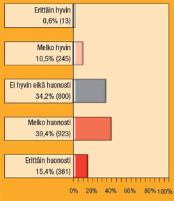 Vastaajia pyydettiin myös arvioimaan sitä, kuinka tyytyväisiä yliopistoon ollaan työpaikkana. Yhteensä 44 prosenttia oli erittäin tai melko tyytyväisiä. Kokemukset kentällä ovat selvästi melko jakautuneita, sillä 37 prosenttia oli melko tai erittäin tyytymättömiä. Vaasan yliopistossa oltiin positiivisimmalla mielellä, kun taas Itä-Suomesta löytyi jälleen negatiivisin palaute. Professoriliiton jäsenistä puolet on tyytyväisiä yliopistoon työpaikkana. Tieteentekijöiden liiton jäsenistä selvästi vähemmän eli 38,5 prosenttia. Neutraalisti suhtautuvia on lähes neljännes. Vapaus vähentynyt, byrokratia ei Vastaajille esitettiin kaikkiaan 18 väittämää yliopistouudistuksesta. Eniten oltiin samaa mieltä siitä, että akateeminen vapaus on vähentynyt. Vähiten tukea löytyi väittämille: byrokratian määrä on pienentynyt, opetushenkilöstöä on enemmän, yksikössäni on enemmän rahaa kuin ennen. Viidennes vastaajista katsoi, että hallinnolliset tehtävät vievät vähemmän aikaa kuin ennen. Vajaa neljännes piti yliopistojen ulkopuolisen edustuksen kasvamista hallinnossa myönteisenä. Ainoita positiivisia signaaleja vastausten perusteella oli se, että virkasuhteen muuttuminen työsuhteeksi oli ilmeisesti sujunut yliopistoissa melko kivuttomasti. Professorit torjuivat selvästi väitteen ”pystyn nykyään keskittymään paremmin ydintehtäviini” — noin 80 % oli tästä täysin tai melko eri mieltä. Yliopistouudistuksen ensimmäisenä vuotena hallinnolliset tehtävät ovat kuormittaneet paljon professoreita. Tulokset tukevat tätä tietoa: 65 % on täysin tai melko eri mieltä väitteestä ”hallinnolliset tehtävät vievät vähemmän aikaa kuin ennen”. Yliopistouudistusta markkinoitiin yliopistoväelle mm. sillä, että virkasuhteitten muuttaminen työsuhteiksi on avain pätkätyöongelman poistumiseen. Tieteentekijöiden liiton yliopistoissa toimivasta jäsenkunnasta, josta noin 70 % on määräaikaisissa tehtävissä, ei ole vielä havainnut muutosta parempaan. Vastaajista 66 % ei tue väittämää ”määräaikaisten työntekijöiden asema on parantunut”. Ainoastaan viitisen prosenttia on samaa mieltä. Byrokratia on työllistänyt ja aiheuttanut turhaa vaivaa muutenkin kuormitetulle henkilöstölle. Professoreista peräti 89 prosenttia on täysin tai melko eri mieltä väitteestä ”byrokratia on vähentynyt”. Tieteentekijät olivat vielä vähän kriittisempiä: väitteen torppasi 92 prosenttia vastaajista. Tietojärjestelmät sapettavat Avovastaukset ovat mielipidekyselyn melkein paljastavinta luettavaa. Niitä kertyi kaikkiaan 1002 kappaletta – osa pitkiä, lähes puolen liuskan vuodatuksia, osa parin lauseen napakoita tokaisuja. Kirjoituksissa vaadittiin hallinnon ja byrokratian vähentämistä, johtamisen ja työhyvinvoinnin kehittämistä sekä määräaikaisten parantamista. Erityisenä purnauksen kohteena olivat yliopistojen toimimattomat tietojärjestelmät. ”Vähemmän byrokratiaa, seurantaa, hankalia kaavakkeita, huonosti toteutettuja nettiohjelmia (SOLE. SAP, TUHAT, vaati/henki ym.), tarpeettomia neuvotteluita. Pois ’tulosvastuu’ ja tuotantomääriin perustuva rahoitus. Pois tarpeeton työtuntiseuranta. Ei isoja laitoksia, joissa pienet oppialat jäävät alakynteen.” ”Byrokratiaa ja hallintoa on ehdottomasti saatava vähennettyä! Tuntuu, että jatkuvasti hallinnon työpaikkoja vain lisätään ja samaan aikaan myös muu henkilökunta (opettajat/tutkijat) joutuvat tekemään hallinnollista työtä koko ajan enemmän.” Liitoilta toivotaan lisää vaikuttamista Professoriliitto ja Tieteentekijöiden liitto teettivät mielipidekyselyn myös oman toimintansa kehittämiseksi. Vaikka yliopistouudistukseen vaikuttaminen on ollut viime vuodet liittojen agendan painopisteenä, vastaajista 60 prosenttia toivoo, että liitot vaikuttavat yliopistojen kehitykseen jatkossa yhä enemmän. 36 prosenttia kokee, että vaikuttamista voi olla saman verran kuin aiemmin. Eniten lisävaikuttamista toivoivat Itä-Suomen (Joensuu) ja Lapin yliopiston vastaajat, liikunta- ja kasvatustieteilijät, lehtorit, Professoriliiton jäsenet sekä ne, jotka suhtautuivat yliopistouudistuksen onnistumiseen negatiivisimmin. ”Liittojen pitäisi pyrkiä vaikuttamaan niihin asioihin, millä yksittäiset tutkijat voisivat paremmin hoitaa tutkimustehtäväänsä. Perinteisesti liitot ajavat jäsentensä työsuhde-etuja, mutta niillä voisi olla painava sana yliopistojen toimivuudenkin parantamisessa.” Teksti: Kirsti Sintonen