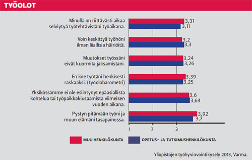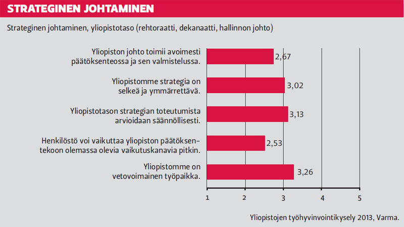 Yliopistojen työhyvinvointi vaikuttaa parantuneenTyöeläkevakuutusyhtiö Varman selvityksessä yliopistojen työhyvinvointi todettiin 2013 paremmaksi kuin koskaan aiemmin. Tulokset eivät kuitenkaan ole suoraan vertailukelpoisia aiempien vuosien tulosten kanssa. Yliopistojen työhyvinvointi vaikuttaa parantuneen työeläkevakuutusyhtiö Varman tekemän työhyvinvointikyselyn mukaan. Kyselyn keskiarvo oli 1-5 asteikolla 3,43, mikä on aavistuksen enemmän kuin 2012 (3,42). Kyselyn nelivuotisen historian aikana trendi on ollut nouseva, vuonna 2010 keskiarvo oli 3,13 ja 2011 3,32. Parhaat arvot kyselyn osa-alueista saivat oman työn sisältö ja osaaminen (3,72), lähiesimiestyö (3,66) ja laitostason strateginen johtaminen (3,43). Heikoimmaksi osa-alueeksi tutkimuksessa arvioitiin yliopistotason johtaminen ja strategia (2,92). Tulokset eivät kuitenkaan ole suoraan vertailukelpoisia, sillä mukana olevat yliopistot ovat vaihdelleet vuosittain. Tänä vuonna kyselyn muotoa oli hieman uudistettu lähinnä karsimalla kysymysten määrää ja yhdistelemällä vanhoja kysymyksiä. Nyt kysely toteutettiin Helsingin, Itä-Suomen, Jyväskylän, Oulun, Tampereen ja Vaasan yliopistoissa sekä Svenska Handelshögskolanissa, Taideyliopistossa, Tampereen teknillisessä yliopistossa ja Åbo Akademissa. Vastaajia oli ennätysmäärä, 11 700. Parhaat keskiarvot kyselystä saivat Svenka Handelshögskolan, Vaasan yliopisto ja Taideyliopisto. Suuremmista yliopistoista parhaiten pärjäsi Jyväskylän yliopisto. Tämän tarkemmin Varma ei kuitenkaan avaa yliopistojen keskinäistä järjestystä. Ikäryhmittäin tarkasteltuina parhaat pisteet antoivat alle 30-vuotiaat (3,6) ja yli 60-vuotiaat (3,5) vastaajat. 30-59 -vuotiailla keskiarvo oli 3,4. Miesten keskiarvo (3,48) oli hitusen korkeampi kuin naisten (3,4). Suurimmat sukupuolten väliset erot olivat yhteisöllisyydessä: kysyttäessä tasa-arvon toteutumisesta yksikössä miesten keskiarvo oli 3,81 kun naisilla se oli 3,3. Huomattavaa kuitenkin on, että vastanneiden miesten joukossa oli suhteellisesti selvästi enemmän johtajina tai esimiestehtävissä työskenteleviä kuin naisten joukossa. Kyselyyn osallistuneiden opetus- ja tutkimushenkilökunnan edustajien vastauksissa pisteitä tuli omien työtehtävien osa-alueelta. Mahdollisuus käyttää luovuutta työssäni sai pisteet 4,48 ja työtehtävien mielenkiintoisuus ja haasteellisuus 4,45. Omista työtehtävistä akateeminen henkilökunta koki heikoimmiksi perehdyttämisen (2,92) ja mahdollisuuden edetä urallaan (3,01). Enemmän ongelmia nähtiin työoloissa. Minulla on tarpeeksi aikaa selviytyä työtehtävistäni sai pisteet 3,11, mutta toisaalta työn ja elämän pitäminen tasapainossa sai selvästi paremmat pisteet 3,7. Lähiesimiehen koettiin luottavan työntekijöihin ja olevan oikeudenmukaisia. Työn tavoitteiden määrittelyssä ja palautteen määrässä nähtiin kuitenkin kehitettävää. Esimiestyön heikoimmat pisteet tulivat huomion kiinnittämisestä alaisen työn kuormittavuuteen ja jaksamiseen (3,26). Heikoimman yksittäisen arvon akateemiselta henkilökunnalta sai vaikuttaminen yliopiston päätöksentekoon olemassa olevia kanavia pitkin (2,53). Yliopiston ylin johto koettiin muutenkin ongelmalliseksi: johdon avoimuus sai arvon 2,64 ja strategian ymmärrettävyys 2,95. Tutkimuksen teettäneen Varman kehityspäällikkö Maaret Ilmarisen mukaan tulosten paraneminen kertoo yliopistojen esimiestyön kehittymisestä. — Perinteisesti johtaminen on nähty akateemisessa yhteisössä lähinnä välttämättömänä pahana, joka vie aikaa omalta tutkimukselta. Nähdäkseni asenne on hitaasti muuttumassa. Positiivinen kehitys voi kertoa myös siitä, että uuden yliopistolain aiheuttamat suurimmat mullistukset, kuten yliopistojen ja yksiköiden yhdistämiset alkavat olla ohi. — On myös mahdollista, että yliopistoilla on myös totuttu muutokseen. Niinpä uudistukset eivät laske hyvinvointia samaan tapaan kuin ennen. Tutkimuksella saatiin myös tuhansia avovastauksia, joihin monet vastasivat pitkillä teksteillä. Ilmarisen mukaan Varma ei kuitenkaan käy näitä vastauksia läpi vaan ne jäävät yliopistojen tulkittaviksi. Tarkempaa analyysia voi siis vielä olla luvassa yliopistokohtaisesti. Jatkossa kyselyn aikataulua on tarkoitus harventaa joka toiseen vuoteen. Näin joka kyselyyn saataisiin mukaan kaikki yliopistot. Varman mukaan kysely palvelee yliopistojen työhyvinvoinnin kehittämistoimintaa ja siten välillisesti myös yliopistojen tuloksellisuutta. teksti Juha Merimaa