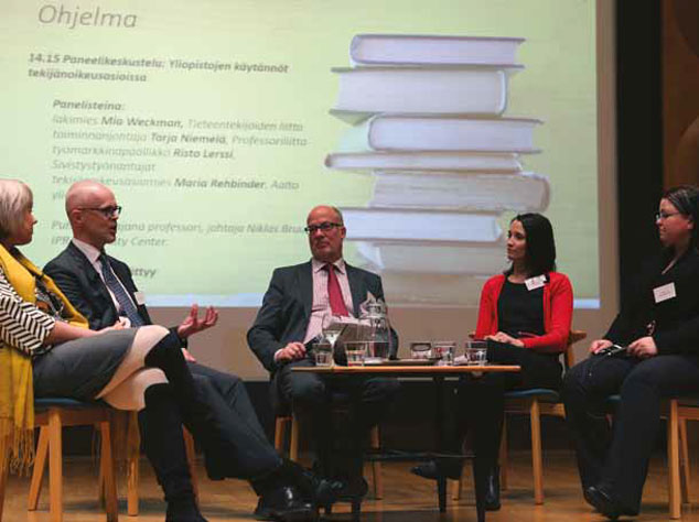 Seminaarissa myös tekijänoikeusneuvoston puheenjohtaja, oikeustieteen professori Marcus Norrgård toi esiin ongelmia, joita kaikkien oikeuksien luovutus yliopistolle työsopimuksella toisi.