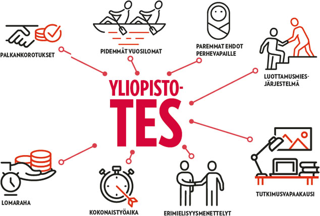 Työntekijän kannalta työehtosopimuksessa on sovittu useista työehdoista lakia paremmin. Suomessa ei ole esimerkiksi lakia euromääräisestä vähimmäispalkasta. Palkkaus määräytyy pitkälti työehtosopimuksen (tes) mukaan. Myös palkankorotukset tulevat tessin kautta. Ilman työehtosopimusta työnantajalla olisi yksin valta päättää palkankorotuksista — tai olla korottamatta palkkoja. Yliopistojen yleisestä työehtosopimuksesta sopivat määräajaksi eli sopimuskaudeksi työnantajien Sivista, Julkisalan koulutettujen JUKO , toimihenkilöiden PRO ja työntekijöiden JHL. Määräajan päättyessä osapuolet neuvottelevat sopimuksen uudistamisen ehdoista. Sopimusneuvottelujen lähtökohtana ovat edellisen sopimuksen määräykset.