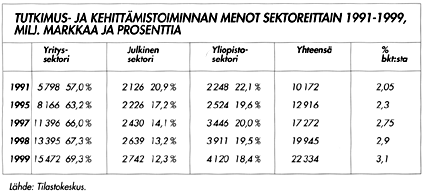 kolme prosenttia bruttokansantuotteesta. Tutkimus- ja kehittämistoiminta on 1990-luvulla