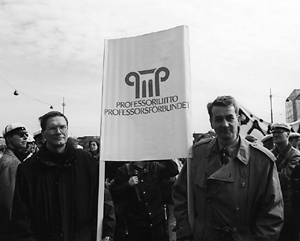 | Professoriliiton toista banderollia kannattelivat