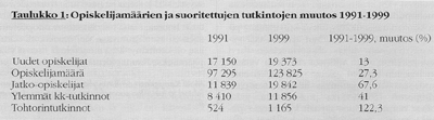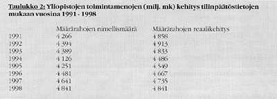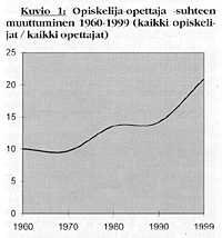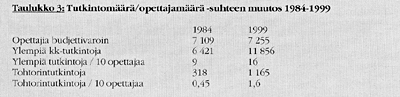 Yliopistobudjetit kasvoivat laskennallisesti mm. kiinteistöjen vuokrien sisällyttämisellä yliopistojen menoihin mutta toiminnan todellisten kustannusten kehityksestä jäätiin vuosikymmenen aikana jälkeen satoja miljoonia markkoja. Lisäksi ulkopuolisella rahoituksella järjestettävä toiminta on laajentunut voimakkaasti ja lisännyt osaltaan henkilöstöön ja yliopistojen infrastruktuuriin kohdistuvia paineita. (Taulukot 1 ja 2.) Tilanne yliopistoissa on nyt käymässä kestämättömäksi. Jo viime vuosikymmen puolivälissä oli Suomessa jääty jälkeen OECD-maiden opettaja-oppilasmäärien _suhteen keskiarvosta. Vuonna 1995 OECD-maiden keskiarvo oli 14,4 _ Suomessa vastaava suhde oli tuolloin 17,9. Nyt tilanne on entisestään huonontunut ja jokaista opettajaa kohden on 20,9 opiskelijaa. (Kuvio 1.) Tämä on tarkoittanut laskennallisen opettajakohtaisen tuottavuuden lisääntymistä mutta samalla kehitys on herättänyt perusteltua huolestumista tarjottavan koulutuksen laadusta. Opettajakohtaisesti mitattuna ylempien korkeakoulututkintojen määrä on lähes kaksinkertaistunut viimeisen viidentoista vuoden aikana ja tohtorintutkintoja tehdään opettajakohtaisesti laskettuna yli kolminkertainen määrä (1984-1999, nousua ylemmissä korkeakoulututkinnoissa opettajaa kohden 81%, tohtorintutkinnoissa samana aikana opettajaa kohden nousua 259%). (Taulukko 3.)