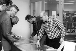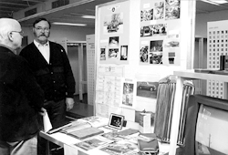 Pasi Tuunainen (vitriinin takana oikealta) ja Risto Turunen kertovat kiellettyjen