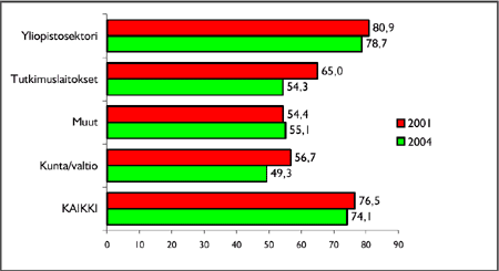 kun kunta/valtiosektorilla vain joka kahdeksas (13,8 %) ja tutkimuslaitoksissa