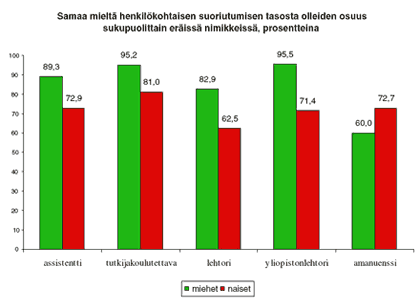 Huolestuttavana havaintona uuden palkkausjärjestelmän sukupuolivaikutusten kannalta voidaan pitää sitä, että kyselyyn vastanneita nais- ja miestutkijoita kohdeltiin selvästi eri tavalla. Kun miespuolisista tutkijoista 47 % arvioitiin opettajajärjestelmässä, niin naisista peräti 72 % arvioitiin opettajien järjestelmässä. Sitä miksi näin tapahtui, ei käytettävissä olevien tietojen perusteella voida sanoa. Opettajien järjestelmässä arvioitiin myös joka viides päällikkö/johtaja, joka seitsemäs amanuenssi ja joka kahdeksas suunnittelija/koordinaattori. Varsin vapaasti ja neuvotteluryhmän ohjeistuksen vastaisesti työnantaja siten käytti oikeuttaan valita sovellettava arviointijärjestelmä.