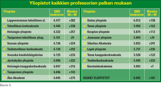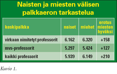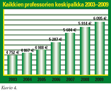 Miesprofessori tienaa 210 euroa naiskollegaa enemmänProfessoriliiton tuoreimman palkkaselvityksen mukaan miesten ja naisten keskipalkkojen erotus on 210 euroa miesten hyväksi. Euromääräinen erotus on jo vuosia pysynyt runsaan 200 euron tasolla. Kaikkien professorien keskipalkka marraskuussa 2009 oli yliopistojen toimittaman aineiston mukaan 6095 euroa. Palkkakehitys oli ansiotasoindeksin mukaista. Professoriliitto teettää vuosittain palkkaselvityksiä. Tämän vuoden tutkimusraportissa pyritään aikaisempia vuosia tarkemmin selvittämään naisten ja miesten välisiä palkkaeroja. Osana tätä tavoitetta pyydettiin yliopistoja nyt ensimmäistä kertaa ilmoittamaan professorien palkkatietojen rinnalla myös professorien virkaikä. Miesten ja naisten välinen keskipalkkojen erotus on 210 euroa miesten hyväksi. Euromääräinen erotus on jo vuosia pysynyt runsaan 200 euron tasolla, näin siitä huolimatta että prosenteissa mitattuna on naisten palkkakehitys kuitenkin ollut hieman nopeampaa. (Kuvio 1.) Professorien palkka kohoaa selvästi 10 ensimmäisen virkavuoden aikana. Miesten pidempi virkaura selittääkin noin puolet miesten ja naisten välisestä palkkaerosta. Merkittävä tekijä palkkaerojen taustalla on myös palvelussuhteen määräaikaisuus, sillä mvsprofessorien osuus naisten keskuudessa (26%) on selvästi suurempi kuin miesten keskuudessa (19%). Mvs-professorien palkka jää noin 800 euroa alhaisemmaksi kuin virkaan nimitetyillä professoreilla. Kolmas palkkaeroihin vaikuttava tekijä on esimiespalkkio. Miehet saavat esimiespalkkiota naisia useammin ja miesten keskimääräiset palkkiot ovat myös hieman suurempia. (Kuvio 2.) Palkkakehitys noudattaa yleistä ansiotasoindeksiä Kaikkien professorien keskipalkka marraskuussa 2009 oli yliopistojen toimittaman aineiston mukaan 6.095 euroa. Kyseessä on UPJ:n mukainen palkka Henki- ja Vaati-osineen tai vaihtoehtoisesti yksilöllinen sopimuspalkka, lisättynä esimiespalkkiolla ja muilla säännöllisesti maksettavilla lisillä. (Kuvio 3. ja 4.) Edelliseen vuoteen verrattuna keskipalkka kohosi 181 euroa eli 3.1%. Edellisen vuoden tavoin professorien palkkakehitys noudatti hyvin tarkasti Tilastokeskuksen yleistä ansiotasoindeksiä, joka kohosi vuoden 2009 aikana 3.0%. Yliopistojen toimittaman aineiston perusteella on myös laadittu yliopistojen välinen palkkavertailu, jossa yliopistot on asetettu kaikkien professorien keskipalkan mukaiseen järjestykseen. (Kuvio 5.) Tyytyväisyys omaan palkkaan on aikaisempaa korkeampi Palkkaansa tyytyväisten professorien osuus on vuosittain tasaisesti kohonnut ja tässä kohdin näkyy selvästi etenkin UPJ:n mukanaan tuomien korotusten myönteinen vaikutus. Nyt palkkaansa tyytyväisten professorien osuus (42%) on nyt korkeampi kuin kertaakaan aikaisemmin; tämä osuus on nyt lähes kaksikertainen vuoden 2001 palkkatutkimukseen (22%) verrattuna. Tyytyväisyyttä tarkasteltaessa vastaajat jaettiin kvartiileittain neljään ryhmään. Tässä tarkastelussa tulee selvästi esiin nykyisen palkan vaikutus tyytyväisyyteen, sillä tyytyväisten osuus kohoaa tasaisesti alimman kvartiilin 27 prosentista ylimmän kvartiilin 57 prosenttiin. Aineistossa 2398 professorin tiedot Professoriliiton vuosittaiset palkkakyselyt toteutettiin jälleen marraskuussa 2009. Perinteiseen tapaan tietoa palkoista kerättiin sekä jäseniltä että työnantajailta. Yliopistoille kohdistetussa kyselyssä työnantajia pyydettiin ilmoittamaan professorien palkkatiedot marraskuulta 2009. Palkkatiedot pyydettiin virka- ja palvelussuhdekohtaisesti eriteltyinä erikseen virkaan nimitettyjen ja mvs-professorien osalta. Yliopistojen toimittama aineisto käsittää yhteensä 2398 professorin palkkatiedot. Vertailukelpoista aineisto on kerätty vuodesta 2003 lähtien. Samanaikaisesti toteutettiin myös rinnakkainen, Professoriliiton jäsenille kohdistettu palkkakysely. Jäsenille kohdistettua kyselyä on nykyisessä muodossa toteutettu vuodesta 2001 lähtien. Jäsenkysely ja yliopistojen toimittamat aineistot täydentävät toisiaan ja yhdessä ne antavat hyvin kattavan kuvan professorien palkkauksesta. Palkkakyselyn tuloksista koostetaan raportti, joka perinteiseen tapaan postitetaan kaikille Professoriliiton jäsenille. Yrjö Lauha