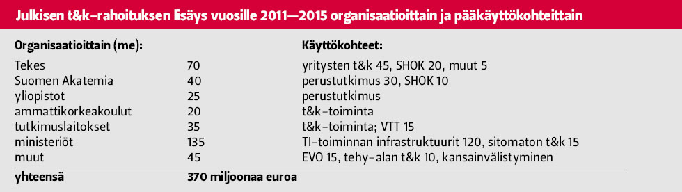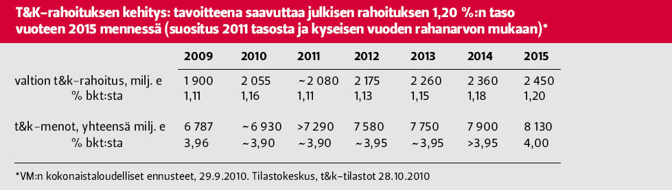 Tutkimusrahoitukseen Nokian mentävä aukko?Yksityinen t&k-rahoitus uhkaa kärsiä kovan kolauksen Nokian ratkaisun vuoksi. Tutkimus- ja innovaationeuvoston pääsihteeri Ilkka Turunen haluaa rauhoitella. Hallituksen on annettava selkeä viesti, että julkinen valta pysyy tutkimukseen ja osaamiseen panostamisen tiellä. Pääministerin johtama tutkimus- ja innovaationeuvosto (TIN) hyväksyi ennen joulua koulutus-, tutkimus- ja innovaatiopoliittisen linjaraportin. Valtioneuvosto julkisti asiasta tiedotteen nettisivuillaan, mutta mediassa siitä ei ole ihmeemmin näkynyt jälkiä, vaikka linjaus määrittelee pitkälti seuraavan hallituskauden tutkimuspolitiikan. Tutkimus- ja innovaationeuvoston pääsihteeri Ilkka Turusen mielestä neuvoston linjaukseen ei sisälly päivänpolitiikan kannalta suuria uutisia. Suomen tutkimus- ja innovaatiojärjestelmää on parin viime vuoden aikana analysoitu kotimaisin ja ulkomaisin voimin tavallista perusteellisemmin. On syntynyt yhteinen näkemys asialistasta. Jo ennen lamaa oli käynnistynyt historiallisesti suuri tutkimus- ja innovaatiojärjestelmän uudistus. Sen kärjessä tietysti yliopistoreformi. Esko-Olavi Seppälä, joka oli Ilkka Turusen edeltäjä neuvoston pääsihteerinä, kuvasi Suomen tiede- ja teknologiapolitiikkaa norsupoluksi, joka on kulkenut viivasuoraan hallituskoalitioista riippumatta. Peruslinjauksista Suomessa on vallinnut laaja yksimielisyys, Turunen toteaa ja painottaa, että määrätietoinen ja pitkäjänteinen panostus tutkimukseen ja osaamiseen on ollut Suomen keskeinen vahvuus. Mutta silti jokainen hallitus on laittanut ja varmaan haluaa myös jatkossa laittaa asiaan oman puumerkkinsä. Turunen nostaa uusimmasta linjauksesta esille kolme keskeistä kohtaa. Kaikki tahot ovat yhtä mieltä siitä, että nyt pitää panostaa tutkimuksen infrastruktuuriin. Siinä olemme jääneet jälkeen. Tutkimusinfrastruktuurien tiekartta on tehty. Nyt se pitää päivittää, rahoittaa ja panna toimeen. On perustettava toimielin, joka valmistelee ja toteuttaa infrastruktuuripolitiikkaa. Toisena keskeisenä asiana hän mainitsee tutkijanuran, nimenomaan väittelyn jälkeisen vaiheen kehittämisen. Kolmanneksi Turunen nostaa sen, että linjauksessa pannaan paljon painoa innovaatiojärjestelmän laaja-alaiseen kehittämiseen. Tutkimus- ja innovaatiotoimintaa harjoittavien yritysten määrää pyritään kasvattamaan. Yksi keino tässä on ottaa käyttöön yrityksille suunnattu verokannustin. Neljän prosentin tavoite karkasi? Siteeratuin kohta tutkimus- ja innovaationeuvoston (ent. nimi tiede- ja teknologianeuvosto) raportista on aina ollut rahoituslinjaus. Professoriliitto ja Tieteentekijöiden liittokin ovat yliopisto- ja tutkimusrahoihin liittyvissä lukuisissa tiedotteissa ja lausunnoissaan toistaneet jatkuvasti mainintaa rahoitusta on lisättävä vähintään tiede- ja teknologianeuvoston esitysten mukaisesti. Turunen pitää tärkeänä, että nytkin, riippumatta taloudellisesti vaikeista ajoista, tavoite on ylläpitää t&k-rahoituksen bkt-osuus neljässä prosentissa koko 2010-luvun. Jos seuraava hallitus tähän sitoutuu, sitä voidaan pitää tutkimukseen panostavana hallituksena, Turunen toteaa. Linjauspaperin mukaan yksityisen sektorin osuus t&k-rahoituksesta olisi vähintään kaksi kolmasosaa. Nokian ja Microsoftin kumppanuuden myötä tämä tavoite muuttuu yhä haastavammaksi. Vuonna 2009 yksityisen sektorin t&k-menot olivat 4,8 miljardia euroa (71 prosenttia kaikista t&kmenoista), josta Nokian osuus oli noin puolet. Kriisien ja rakennemuutosten aikana julkisen vallan toimilla ja oikeansuuntaisilla viesteillä julkisuuteen, tutkimuskentälle ja yrityksille on tavallista suurempi merkitys. Suomessa on ajateltu ja toimittu niin, että julkisilla panostuksilla tutkimus- ja kehitystoimintaan olisi mahdollisimman suuri vipuvaikutus yksityisen sektorin innovaatiotoimintaan. Vaalien jälkeisen hallituksen pitäisi omilla toimillaan viestiä, että julkisen vallan tavoitteena on pitää kiinni pitkästä linjasta, jolla halutaan luoda Suomeen maailman luokan osaamista ja tutkimusympäristöjä. Kivutonta uudistaminen ei ole. Kilpaillun rahoituksen osuus ei enää kasva Julkisen rahoituksen osuutta t&k-rahoituksesta on tarkoitus nostaa. Vuonna 2009 se oli 26 prosenttia. Ilkka Turunen pitää tärkeänä, että prosenttien ohella puhutaan myös euroista. TIN:n esityksen mukaan julkisen t&k-rahoituksen lisäys vuosille 20112015 on yhteensä 370 miljoonaa euroa. Kilpaillun rahoituksen osuutta ei enää kasvateta. Hiljattain ilmestynyt Tutkimuksen tuottavuuden kehitys Suomen yliopistoissa -raportti (opetus- ja kulttuuriministeriön julkaisuja 2011:2) osoittaa selvästi, että ulkopuolisen rahoituksen kasvu on jo saavuttanut kipupisteensä. Raportissa väitetään, että ulkopuolisen rahoituksen lisäys on vähentänyt tutkimuksen tuottavuutta. Hankkeissa tutkimusta eivät tee professorit ja muut senioritutkijat vaan tutkimustaipaleensa alussa olevat maisterit. Määräaikaisten resurssien yleisyys heikentää tutkimustyön laatua ja sitoutumista yliopistouralle. Turunen pitää yliopistoissa käyntiin lähteneitä tenure-uramalleja hyvänä edistysaskeleena Tutkimuksen laatua aiotaan nostaa myös rahoitusmittareita kehittämällä. Yliopistojen uudessa rahoitusmallissa tutkimuksen painoarvo tulee olemaan nykyistä suurempi. Yliopistojen rahoitukseen tutkimus- ja innovaationeuvoston esitys tarkoittaa valtiolta tulevan perusrahoituksen kumulatiivista 4 x 21,5 miljoonan euron lisäystä vuosina 20122015 siten, että rahoituksen taso nousee noin 86 miljoonalla eurolla ajanjakson loppuun mennessä. Turunen muistuttaa, että yliopistorahoitus on turvattu yliopistoindeksillä. Tänä vuonna tämä tarkoittaa 45 miljoonan euron lisäystä yliopistojen valtionrahoitukseen. Yliopistojen rahoituspohja on laajentunut: ne voivat käyttää toimintaansa myös yliopiston liiketoiminnasta, lahjoituksista ja pääomatuotosta kertyvää varallisuutta. N