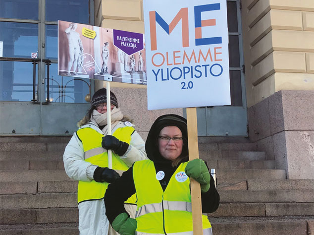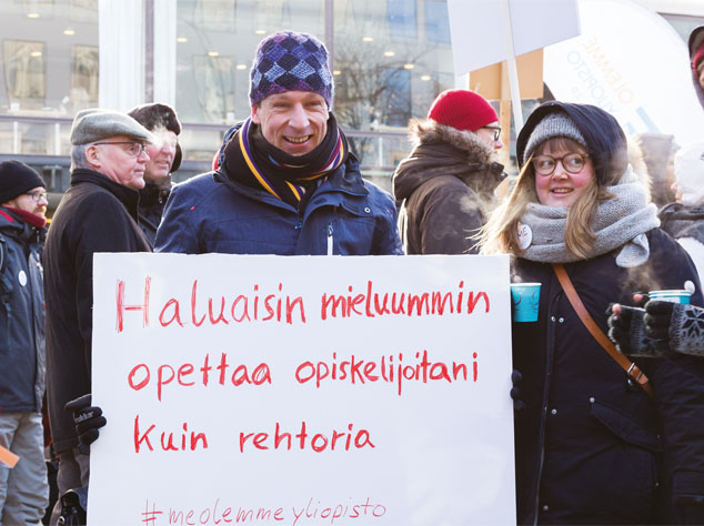 Paikalla oli kaikkien henkilöstöryhmien edustajia sihteereistä professoreihin. Me olemme yliopisto -tunnuksen lisäksi kylteissä näkyi muitakin osuvia tekstejä: ”Haluaisin mieluummin opettaa opiskelijoitani kuin rehtoria”, ”Totally fed up”, ”Overworked underpaid”, ”Halvensimme palkkoja”.