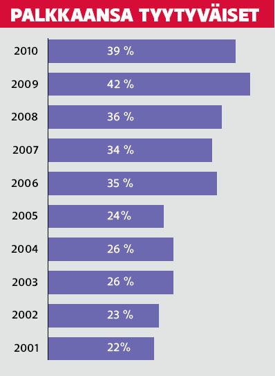 Jäsenkyselyn mukaan palkkaansa tyytyväisten professorien osuus on 39 %. Osuus on vuoteen 2001 ulottuvan tarkastelujakson aikana kohonnut 22 prosentista nykyiselle tasolle 40 prosentin tuntumaan. (Katso kuvio.) Tämän vuoden tutkimusraportissa on tarkasteltu tavallista tarkemmin naisten ja miesten välisiä palkkaeroja. Miesten ja naisten välinen keskipalkkojen erotus on yliopistojen toimittaman aineiston mukaan 273 euroa ja jäsenkyselyn mukaan 288 euroa miesten hyväksi. Naisten hieman nopeammasta palkkakehityksestä huolimatta palkkaero on pysynyt samalla tasolla. Palkkaerojen perustella voidaan myös laskea naisten euro, joka on 95,5 senttiä.