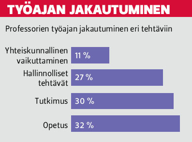Vuosityöaika on keskimäärin 2 165 tuntia Jäsenten palkkakyselyn yhteydessä on toteutettu vuosittain vaihtuva ajankohtaisia teemoja käsittelevä osio. Tällä kertaa tässä yhteydessä arvioitiin vuosittaista työaikaa ja työolosuhteisiin liittyviä asioita. Professorien vuosityöaika on jäsenten arvioimana keskimäärin 2 165 tuntia. Esimiestehtävissä toimiville professoreille kertyy noin 100 työtuntia enemmän kuin muille professoreille. Työtuntien määrä näyttää myös nousevan palkan kohoamisen myötä. Vakinaiset professorit ilmoittavat paiskivansa töitä vajaat 100 tuntia enemmän kuin määräaikaiset. Jäsenkyselyn mukaan miehet ylittävät naisten vuosityöajan 12 tunnilla. Ajankäyttöä arvioitiin myös eri tehtävien näkökulmasta; professorien työpanos vaikuttaa jakaantuvan melko tasaisesti opetuksen, tutkimuksen ja hallinnollisten tehtävien kesken, opetuksen kuitenkin asettuessa niukasti ensimmäiselle sijalle. Yrjö Lauha