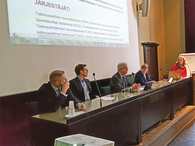 Etiikan päivän paneelissa olivat mukana metsäjohtaja Tomi Salo Metsäteollisuus ry (vas.), tiede- ja korkeakoulupolitiikan asiantuntija Heikki Holopainen Sivistystyönantajat, akateemikko Risto Nieminen, yliopistotutkija Karoliina Snell ja moderaattorina toimi pääsihteeri Reetta Kettunen Tiedonjulkistamisen neuvottelukunnasta.