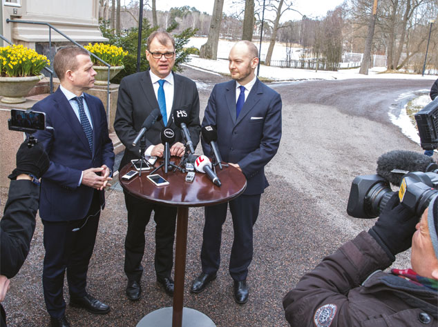 Hallituksen trio kokoontui pääministerin virka-asunnon edustalle kertomaan kehysriihen aloitustunnelmia 10. huhtikuuta.