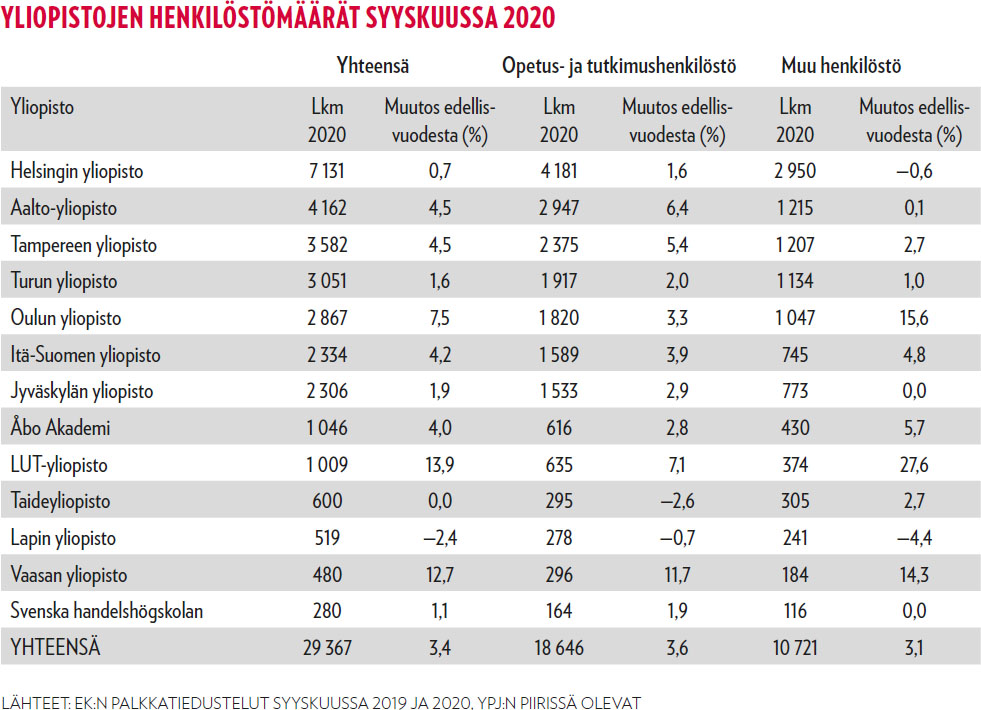 Suomen yliopistoissa oli viime vuonna enemmän opettajia ja tutkijoita kuin koskaan, kertoo Sivistystyönantajien tuore tilastojulkaisu. Opetus- ja tutkimushenkilöstön määrä kasvoi 3,6 prosenttia vuosina 2019–2020. Kaikkiaan yliopistoissa on silti edelleen 3 prosenttia vähemmän työntekijöitä kuin 2010-luvun alussa.
