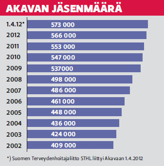 Akava jo toiseksi suurin keskusjärjestöAkava on maksavissa jäsenissä mitattuna noussut jo toiseksi suurimmaksi palkansaajien keskusjärjestöksi. Kun Suomen Terveydenhoitajaliitto STHL liittyi huhtikuun alussa Akavaan, akavalaisten kokonaislukumäärä on 573 405. Kasvua vuoden takaiseen on yli 20 000 jäsentä. Miesten ja naisten osuus akavalaisista on pysynyt ennallaan. Naisia on enemmistö, 52 prosenttia. Jäsenistä 56 prosenttia on yksityisen sektorin palkansaajia, julkisella sektorilla työskenteleviä 41 prosenttia ja itsensä työllistäviä 3 prosenttia. Vuoden 2011 Akavan järjestötutkimuksen mukaan palkka- ja työsuhdeturva sekä ansiosidonnainen työttömyysturva ovat merkittävimmät syyt kuulua ammattiliittoon. Turvan lisäksi akavalaiset pitävät jäsenyydessä tärkeinä mahdollisuutta ammatilliseen kehittymiseen, verkostoitumista ja henkilökohtaista apua työelämän ongelmatilanteissa. Akavalaisten mielestä keskusjärjestö on onnistunut edunvalvonnassa viimeisen neljän vuoden aikana selvästi aikaisempaa paremmin. Lisäksi akavalaisten usko oman keskusjärjestön vaikutusvallan kasvuun on noussut.