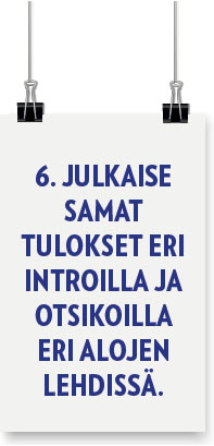 Heiskalan mukaan tulosten jakaminen mahdollisimman pieniin yksiköihin sekä samojen tulosten jakaminen eri otsikoilla ja eri johdannoilla maksimoivat nopeasti julkaisumääriä. Heiskala suosittaa jopa julkaisemaan samat tulokset mahdollisimman monissa lehdissä, editoituina.