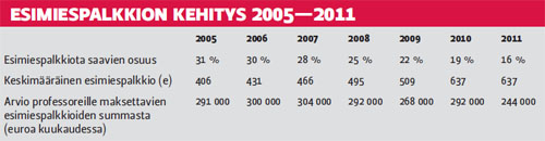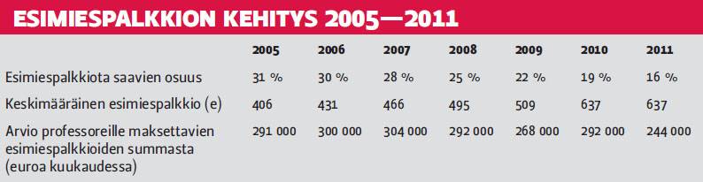 Vastuu kasvoi, esimiesten palkkiot eivätAikaisemmin virkaehtosopimukseen sisältyivät suhteellisen yksityiskohtaiset määräykset yliopistojen esimies- eli hallintotehtävien ja johtamistehtävien palkkioista. Sopimukseen sisältyivät myös esimiespalkkioiden yliopistokohtaiset vähimmäismäärät. Monissa yliopistoissa nämä vähimmäismäärät käytännössä ylitettiin. Tilanne on muuttunut johtamispalkkioita koskevien kollektiivisopimustason määräysten osalta. Yliopistojen yleisen työehtosopimuksen 6. luvun 11 §:n 2 momentin mukaan yliopisto maksaa päätöksensä mukaisesti akateemisille johtajilleen johtamispalkkioita. Palkkioiden suuruudesta tai kohdentumisesta ei ole mainintaa työehtosopimuksessa. Ne on jätetty yliopistokohtaisen soveltamisen varaan. Sopimuksen 6. luvun 11 §:n 2 momentti osoittaa kuitenkin, että johtamispalkkiojärjestelmä on tarkoitettu yliopistoissa pysyväksi. Yliopistojen uusi palkkausjärjestelmä (YPJ) on korostanut esimiesten merkitystä tarkoituksenmukaisen ja oikeudenmukaisen palkan määrittelyssä. YPJ merkitsi myös esimiesten tehtävien lisääntymistä ja henkilöstöpoliittisen vastuun kasvamista. Vuonna 2010 toteutettu yliopistouudistus lisäsi edelleen esimiesten vastuuta ja tehtäviä. Ohessa on esimiespalkkioiden kehityksen yhteenveto, joka on laadittu eri yliopistoista saatujen tietojen perusteella. Siitä näkyy, että vuosina 2005— 2011 esimiespalkkioiden kokonaisvolyymi on selvästi laskenut yliopistolaitoksessa. Esimiespalkkioiden kokonaisvolyymikehitys ei ole vastannut esimiesaseman muutosta ja kasvanutta vastuuta. Useimmat akateemiset johtajat ovat professoreita. Akateemisten johtajien tehtävät suoritetaan yleensä professorien muiden tehtävien ohella. Professoreilta on tullut runsaasti viestejä siitä, että nykyisten palkkioiden taso ei vastaa esimiestehtävien vaatimuksia. Esimiespalkkioiden osuus professorien kokonaispalkkapotista on pudonnut vuosituhannen alun vajaasta kolmesta prosentista runsaaseen kahteen prosenttiin. Tämä ei voi olla viesti siitä, että akateemisia johtajia todella arvostettaisiin myös taloudellisesti. Palkkiojärjestelmän tulisi olla nykyistä kannustavampi sekä hyviin esimiessuorituksiin että hyvien akateemisten johtajien valikoitumiseen. Tämä olisi kaikkien yliopistolaisten etu. Professoriliitto on esittänyt yliopistoille akateemisten johtajien johtamispalkkioiden korottamista. Tämä voitaisiin tehdä yliopistoissa liiton mielestä yhteistyössä asianomaisten järjestöjen edustajien kanssa. Jorma Virkkala
