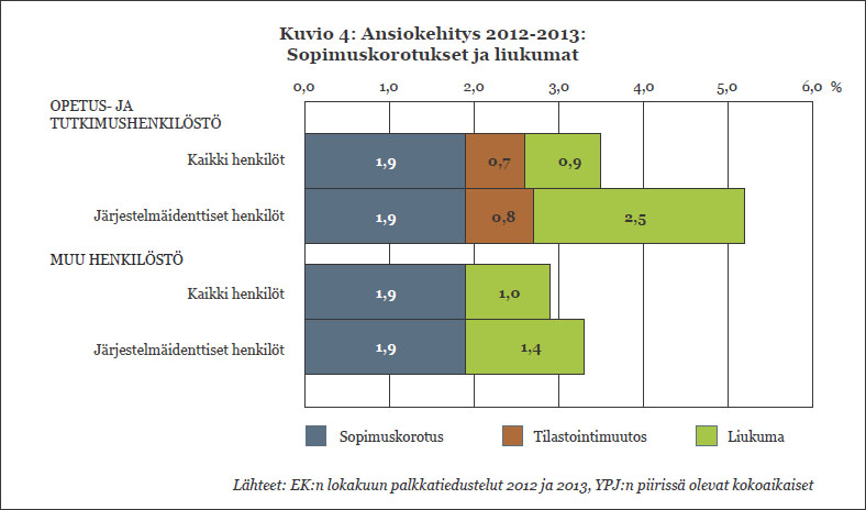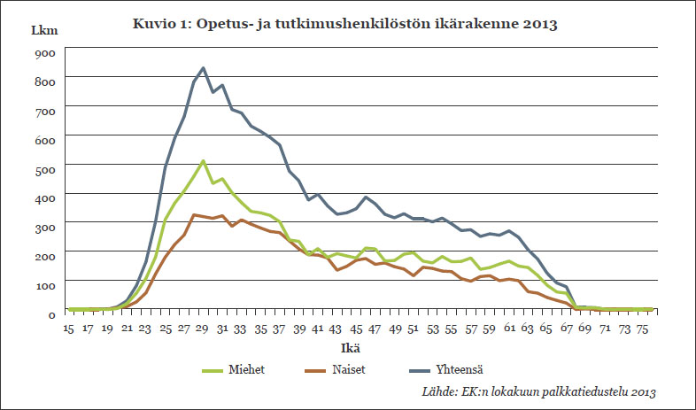 Yliopistohenkilöstön määrä väheneeSivistystyöantajat on julkaissut varsin monipuolisen selvityksen yliopistojen henkilöstöstä. Sen mukaan yliopistolaisten määrä vähenee, opetus- ja tutkimushenkilöstöstä on vakinaisessa työsuhteessa 28 prosenttia, mutta ansiokehitys on ollut kohtuullista. Kaikki yliopistot ja monet muut oppilaitokset ovat luovuttaneen neuvottelu- ja sopimusoikeutensa Sivistystyöantajille (Sivista). Sivista seuraa yliopistojen henkilöstöasioita ja raportoi niistä. Vähän aikaa sitten on ilmestynyt Tilastojulkaisu 2013, Yliopistot. Se on kokonaisuudessaan luettavissa Sivistan verkkosivuilta, www.sivistystyoantajat.fi. Tilastojulkaisu on lajissaan laajin ja monipuolisin. Kaikilta osin vastaavia tietoja ei ole aikaisemmin ollut käytössä. Henkilöstön ikäjakauma ja määräaikaisuus Yliopistohenkilöstön määrä on vähentynyt 1,7 prosentilla 2012—2013. Muun henkilöstön kohdalla vähennys on 2,7 ja opetus- ja tutkimushenkilöstössä 1,1 prosenttia. Yliopistojen välillä on melko isoja eroja: Aalto-yliopistossa henkilöstöä oli viime syksynä 5 prosenttia vähemmän kuin edellisenä vuonna, vastaavasti hankenilaisten määrä kasvoi 3 prosentilla. Opetus- ja tutkimushenkilöstön (= ”ope”) ikärakenne poikkeaa muista työpaikoista valtavasti. Syykin on selvä ja ilmeisen odotettu: tohtorikoulutetta vien suuri joukko, yli neljännes koko opetus- ja tutkimushenkilöstöstä, saa aikaan terävän piikin käyrässä. Sen sijaan esim. professorien ”suuret ikäluokat” eivät juuri tule esiin käyrässä. Muun henkilöstön (=”muhe”) ikäjakauma on hyvin tavanomainen muihin työpaikkoihin verrattuna. (Kuvio 1) Opetus- ja tutkimushenkilöstöstä vakinaisessa työsuhteessa oli 28 prosenttia ja muusta henkilöstöstä 78 prosenttia. Suuri vaikuttaja määräaikaisten suureen määrään ovat tutkijakoulutettavat, jotka käytännössä kaikki ovat määräaikaisia. Tämä ei ole kuitenkaan ainoa syy ”open” näinkin suuren määräaikaisuuteen. Kaikilla vaativuustasoilla ”open” alttius joutua määräaikaiseksi on suurempi kuin ”muhen”. Esimerkiksi ”open” ylimmillä vaativuustasoilla 8—11 määräaikaisia oli 28 prosenttia ja ”muhen” ylimmillä vaativuustasoilla 11—15 määräaikaisia oli 12 prosenttia. Nyt käytettävissä olevasta Sivistan julkaisusta ei näy yliopistokohtaiset erot määräaikaisuuksissa. Eroja on kuitenkin paljon. (Ks. esim. professorien osalta Acatiimi 3/2014: vaihteluväli professorien määräaikaisuuksissa oli tiedeyliopistoissa 7 prosentin ja 41 prosentin välillä. Taideyliopisto oli ihan oma lukunsa tässä suhteessa.) Palkkauksen rakenne ja ansiokehitys Muun henkilöstön kohdalla tehtävän vaativuusosa määrittää keskimäärin vajaata 80 prosenttia palkasta, suoriutumisosa 20 prosenttia ja lisät 2 prosenttia. Luontaisetuja ei käytännössä ole. (Kuvio 13) Henkikohtaiset palkkarakenne-eroavaisuudet voivat toki olla suuria. Jollakin suoriutumisosa voi olla noin 30 prosenttia kokonaispalkasta. Opetus- ja tutkimushenkilöstön palkkarakenne vastaa suunnilleen ”muhen” palkkarakennetta. ”Open” palkoissa on huomioitu Sivistan aikaisemmista tilastoista poiketen lisäelementtinä akateemisten johtajien palkkiot. (Kuvio 12) Yleinen ansiotasoindeksi nousi vuodesta 2012 vuoteen 2013 vajaalla 2 prosentilla. Eräillä EK:n aloilla korotus oli vielä pienempi. Yliopistojen ansiokehitys 2012—2013 on ollut suhteellisen hyvää. Sopimuskorotusten vaikutus on 1,9 prosenttia kaikilla. Tämän päälle on tullut noin yhden prosentin liukuma keskimääräisesti. Järjestelmäindenttisillä (=sama hetu ja sama palkkausjärjestelmä) korotus on ollut vielä selvästi tätä suurempi. (Kuvio 4) Kuviossa 4 ruskealla merkitty korotusosa johtuu tilastointimuutoksesta. Nyt on ensimmäisen kerran otettu ”opeilla” huomioon säännöllisen työajan ansiossa myös akateemisten johtajien (esim. dekaanit, laitosjohtajat) palkkiot. Tämä tilastointimuutos aiheuttaa ”opeille” n. 0,7 prosentin keskimääräisen näennäisen korotusvaikutuksen verrattuna vuoteen 2012. Akateemisten johtajien palkkiot kohdistuvat henkilöstöryhmistä valtaosin professoreihin. Kyse ei ole siis todellisesta muutoksesta, vaan professorit ovat aikaisemminkin saaneet akateemisten johtajien palkkioita. Professoreilla tilastointimuutos on aiheuttanut noin 2,3 prosentin näennäisen korotusvaikutuksen. Tilastointitavan muutos voi avata tietä väärinymmärtämisen mahdollisuudelle. Professoriliiton jäsenkyselyn mukaan jäsenten palkat nousivat oikeasti keskimäärin 2,9 prosenttia vuodessa, mikä sinänsä on hyvin tyydyttävä palkkakehitys. teksti Jorma Virkkala