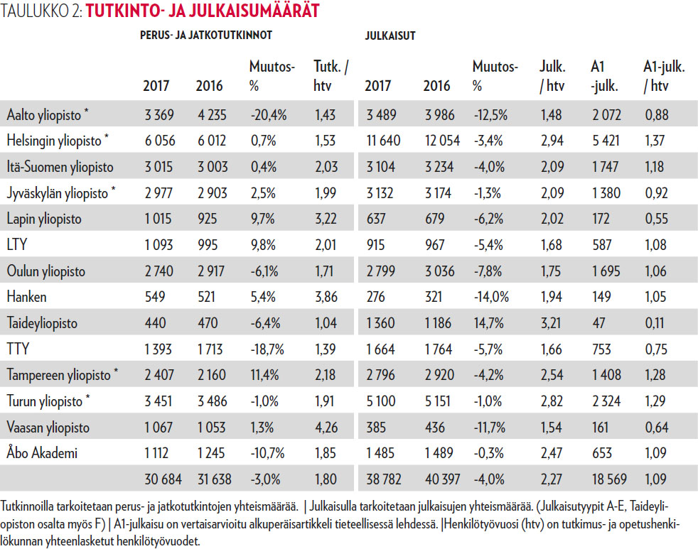 Suoritettujen tutkintojen kokonaismäärä (perus- ja jatkotutkinnot) oli Opetushallinnon tilastopalvelun mukaan 3,0 prosenttia pienempi kuin vertailuvuonna3. Tutkintoja suoritettiin yhteensä 30.684 kappaletta. Eniten tutkintojen määrä laski Aaltoyliopistossa (-20,4%) ja Tampereen teknillisessä yliopistossa (-18,7%). Suhteessa tutkimus- ja opetushenkilökunnan henkilötyövuosiin (myöhemmin henkilötyövuosi) tutkintoja suoritettiin 1,80 kappaletta henkilötyövuotta kohden (1,85 kappaletta per henkilötyövuosi vuonna 2016). Eniten tutkintoja henkilötyövuosiin suhteutettuna suoritettiin vertailuvuoden tapaan Vaasan yliopistossa (4,26), Hankenissa (3,86) ja Lapin yliopistossa (3,22).