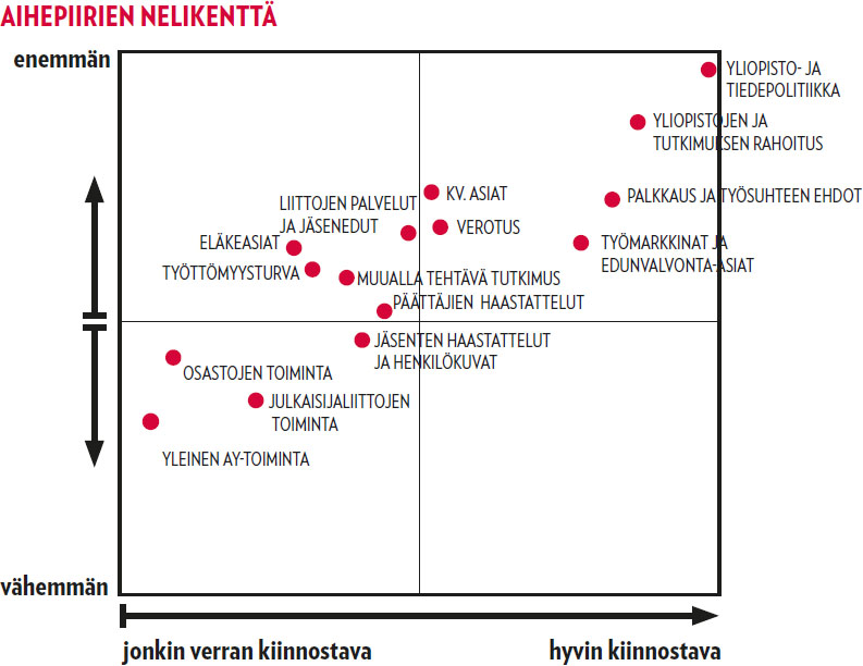 Aihepiirien kiinnostavuuden osalta julkaisijaliittojen jäsenten mieltymyksissä oli hieman eroja: Tieteentekijöiden liton jäsenten joukossa korostuu kiinnostus edunvalvontaan ja palkkaukseen sekä muualla kuin yliopistoissa tehtävää tutkimusta kohtaan. Professoriliiton jäseniä puolestaan kiinnostaa erityisesti yliopisto- ja tiedepolitiikka sekä rahoituskysymykset. Englanninkieliset lukijat toivovat lisää informaatiota eläkeasioista, työttömyysturvasta ja verotuksesta.