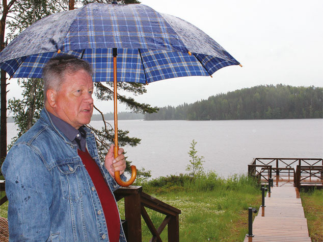 harvinainen sadepäivä. Hannu Ylönen esittelee hienoa rantasaunaa ja terassia, joissa kelpaa rentoutua tutkimuspäivän päätteeksi.