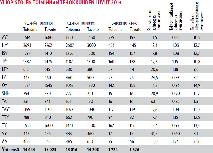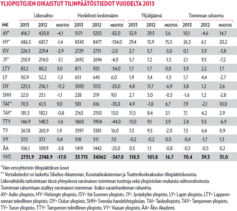 Sijoitusten tuotot pitivät yliopistojen tilinpäätökset ylijäämäisinäSuotuisa markkinatilanne piti yliopistojen talouden positiivisena. Toiminnan tehokkuutta arvioitaessa voidaan havaita yliopistokohtaisia painotuseroja koulutuksen ja tutkimuksen välillä. Jatkossa voisi olla perusteltua, että toiminnan tunnuslukujen raportoinnista säädeltäisiin yliopistolaissa. Yliopistojen liikevaihto laski hieman, mutta tilikauden ylijäämät keskimäärin paranivat. Monen yksittäisen yliopiston osalta ylijäämät kuitenkin supistuivat selvästi. Henkilöstön määrä väheni ja tilakäyttöä pyrittiin tehostamaan. Valtaosa yliopistojen ylijäämistä koostui edellisvuosien tapaan tuloksellisesta sijoitustoiminnasta. Sijoitusvarallisuuden tuottojen käytön periaatteet kuitenkin kaipaavat vielä monen yliopiston osalta läpinäkyvyyden kohentamista. Yliopistojen valtionrahoitus määräytyy koulutuksen, tutkimuksen ja koulutus- ja tiedepolitiikan tavoitteisiin sidottujen mittareiden perusteella. Ylempien ja alempien korkeakoulututkintojen määrässä jäätiin 6 prosenttia tavoitteesta, kun taas tohtorintutkintojen tavoitemäärä ylitettiin 6 prosentilla. Tieteellisten julkaisujen vertailukelpoisessa raportoinnissa on vielä kehitettävää. Verrattaessa suoritettujen tutkintojen ja julkaisujen määrää saatuun valtionavustukseen voidaan havaita yliopistojen välisiä painotuseroja. Yliopistojen ylijäämät ja toiminnan rahavirrat Yliopistojen yhteenlaskettu liikevaihto oli tilivuoden 2013 osalta 2,7 miljardia. Liikevaihdolla mitattuna yliopistojen toiminnan laajuus pysyi kokonaisuutena lähes viime vuoden tasolla. Yliopistojen valtionavustuksen indeksikorotus jäädytettiin vuodelle 2013 ja pääosa yliopistoista raportoikin viime vuotta heikomman liikevaihdon. Vuoden alusta toimintansa aloittaneen Taideyliopiston liikevaihto sen sijaan nousi 9 miljoonaa verrattuna vertailuvuoden Sibelius- Akatemian, Kuvataideakatemian ja Teatterikorkeakoulun yhteenlaskettuun liikevaihtoon. Lisäksi Lappeenrannan teknillisen yliopiston liikevaihdossa oli kasvua 3,7 prosenttia ja Turun yliopiston 0,7 prosenttia. Sen sijaan tilikauden ylijäämät kasvoivat kokonaisuutena arvioiden 16,4 prosenttia päätyen 119 miljoonaan euroon. Ylijäämien kasvua oli kuitenkin vain Helsingin ja Tampereen alueen yliopistojen osalta kun taas muiden ylijäämät pienenivät. Koko yliopistosektorin keskimääräinen henkilöstön määrä laski prosentin verran, joskin Hankenin (SHH) henkilöstön määrä muista poiketen kasvoi 4 prosenttia. Yliopistojen toiminnan rahavirrat kasvoivat 31 miljoonaa euroa. Eniten toiminnan rahavirtaa kasvattivat Aalto (14,7 milj.) ja Helsingin yliopisto (20,2 milj.) sekä Taideyliopisto (10 milj.). Jyväskylän yliopiston (-7,2 milj.) ja Tampereen teknillisen yliopiston (-6,9 milj.) toiminnan rahavirrat supistuivat eniten. TTY:n osalta tilikauden ylijäämä kuitenkin samalla kasvoi (3,9 milj.). TTY:n ylijäämästä 81,3 prosenttia koostui sijoitustoiminnan tuotoista (lähinnä myyntivoitoista). Lisäksi käyvän arvon rahastoa korotettiin 7,1 miljoonaa euroa, jolloin ”reserviin” jäi tilikauden tulokseen kirjaamatonta tuottopotentiaalia (realisoitumatonta arvonnousua). Yliopistoilla on toisistaan poikkeavia arvostusperiaatteita sijoitus- ja rahoitusomaisuuden arvostamisessa, millä on merkittävä vaikutus tilinpäätösinformaatioon. Sijoitustoiminnan tuotot ja niiden käyttö Edellisvuosien tapaan yliopistojen ylijäämistä merkittävä osa koostui sijoitustoiminnan tuloksesta. Sijoitustoiminnan tuloksen osuus tilivuoden ylijäämistä oli 81 prosenttia, kun edellisvuonna sen osuus oli 67 prosenttia. Sijoitustuottojen merkityksen korostuminen antaa viitteitä operatiivisen toiminnan heikkenevästä kannattavuudesta ja/tai sijoitustoiminnan hyvästä suoriutumisesta. Parhaan sijoitustoiminnan tuloksen teki Aalto-yliopisto (31 milj.), Helsingin yliopisto (11 milj.) ja Tampereen teknillinen yliopisto (11 milj.). Yliopistojen sijoitustoiminnan vuosituotto oli keskimäärin n. 7 prosenttia, siltä osin kun yliopistot niistä raportoivat. Sijoitustoiminnan vuosituottojen hajonta oli kuitenkin suhteellisen suuri (LTY vain 1,4% - TAI jopa 17,0%). Sijoitusvarallisuuden tuottojen käyttökohteet on varmasti olleet ajankohtainen keskustelun kohde. Monen yliopiston arkea on viime vuosina leimannut henkilöstön yhteistoimintaneuvottelut ja toimintojen tehostamisen vaatimat uudelleenjärjestelyt. Yliopistojen merkittävä sijoitusvarallisuus on mahdollistanut pääomien kasvattamisen huolellisesti laaditun sijoitusstrategian mukaisesti. Jännitteitäkin sisältävä keskusteluaihe onkin, mihin ja missä määrin sijoitusvarallisuuden tuottoja käytetään? Tähän kysymykseen yliopistojen tilinpäätöksistä saa vain osittaisen vastauksen viiden yliopiston osalta. TTY ja OY ilmoittaa käyttävänsä sijoitustuottoja strategian mukaiseen toiminnan kehittämiseen, ISY ja JY rahastoi sijoitustuottoja ja käyttää niitä valikoiden varsinaisen toiminnan tukemiseen. LTY raportoi käyttävänsä sijoitustuottoja tutkimusrahoituksen hankintaan ja tutkimustulosten kaupallistamiseen. Entä missä määrin? Periaatteessa tuottoja voitaneen käyttää siten, että inflaatiolla korjattu alkuperäinen pääoma säilyy. Teknisesti tuottoja voidaan käyttää harkinnan mukaan, kuten tappiollisen toiminnon kehittämiseen tai toimitilojen kunnostamiseen. Sijoitusvarallisuuden hoidossa kuitenkin keskeinen tavoite on kasvattaa sijoitettavaa pääoma, jolloin absoluuttisen tuoton mahdollisuus on suurempi. Vastaavasti kaiketi sijoitustoiminnan ollessa tappiollinen pitäisi toimintoja supistaa? Yliopistojen sijoitusvarallisuuden tuotto hyvin hajautettuna seurailee yleistä markkinoiden kehitystä. Toiminnan tehokkuuden arviointia Vuoden 2013 alusta voimaan tulleen rahoitusmallin mukaan yliopistojen valtionrahoitus määräytyy koulutuksen, tutkimuksen ja koulutus- ja tiedepolitiikan tavoitteisiin sidottuje