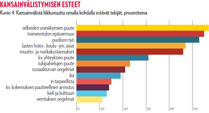 Jatkuvassa epävarmuudessa monet tieteentekijät harkitsevat uran vaihtamista. Tiedeyhteisön kannalta on hälyttävää, että alle 50-vuotiaista yli puolet on harkinnut koko yliopistosektorin hylkäämistä. Yliopistot eivät tähän näytä kuitenkaan vielä havahtuneen. Tutkijoista peräti kaksi kolmesta (63 %) on kahden edellisen vuoden aikana harkinnut siirtymistä täysin toisiin tehtäviin. Myös tohtorin tutkinnon suorittaneet tutkijat ovat harkinneet hakeutumista kokonaan tutkimustehtävien ulkopuolelle yhtä useasti. ”Toimittuani 29 työpätkässä annoin yliopistolle kenkää. En jaksanut enää pätkärahoitusta, vaikka nautin työstäni tutkijatohtorina.” Kansainvälistyminen ja sen esteet Vuoden 2013 kyselyssä kartoitettiin kansainvälistymiseen ja kansainväliseen liikkumiseen liittyviä asioita. Alle 2 viikkoa kestäviin kansainvälisiin konferensseihin tai projektitapaamisiin oli edellisten kolmen vuoden aikana osallistunut 79 % vastaajista. Tiedepolitiikassa kansainvälistyminen ja varsinkin sen väitetty tai oletettu puute on ollut keskusteluissa ase, jolla yliopistoja vastaan on hyökätty. Kyselyn tulosten perusteella väitteillä ei ole perää. Tieteentekijät haluavat kansainvälistyä ja arvostavat sitä, mutta suurimpia kantoja kaskessa ovat selkeiden urakehityksen näkymien puute, työsuhteiden pilkkominen, toimeentulon epävarmuus ja perheasiat (kuvio 4). Kyselyssä selvitettiin myös millaista tukea henkilöt ovat saaneet työyhteisöstään ulkomaille lähtiessään. Yli puolet (57 %) oli melko tyytyväinen saamaansa rahoitukseen, mutta lähes joka viides (19 %) ei ollut saanut rahallista tukea ollenkaan. Suurimmat puutteet olivat lainopillisen tuen (38 %) ja mentoroinnin (39 %) saamattomuudessa. Myöskin ulkomaille lähtöön kannustuksessa oli suuria eroja vastaajien keskuudessa. ”Kv-liikkumistani estää se, etten voi määräaikaisena suunnitella osaamistani kehittäviä kv-vierailuja. Haluaisin todella paljon käydä esim. asiantuntijavaihdossa, mutta 3 kk:n pätkäläisenä suunnittelu on haasteellista.” Tilanne, jossa kansainväliseen liikkuvuuteen osallistuisivat vain perheettömät, riittävän taloudellisen selkänojan omaavat henkilöt ei liene suomalaisen tutkimusmaailman kannalta tavoiteltavana pidettävä olotila. Yllä oleviin epäkohtiin pitää yhteistyössä yliopistojen, tutkimuslaitosten ja tutkimusta rahoittavien kanssa kehittää mekanismeja, jotta toiveet kansainvälistymisestä ja korkean kansainvälisen tason varmistamisesta eettisiä periaatteita noudattaen eivät jää vain sanahelinäksi. teksti Antero Puhakka ja Juhani Rautopuro Kommentti: Moninaisen jäsenkunnan ääni paremmin esilleTieteentekijöiden liiton jäsenkyselyyn tuli 385 avovastausta. Avovastauksissa näkyy liiton jäsenistön moninaisuus, yliopistoissa jäseniä on sekä opetus- ja tutkimushenkilöstössä eri uraportailla että muussa henkilöstössä. Paljon palautetta tuli tällä kertaa siitä, että kyselyssä ja edunvalvonnassa ei oteta riittävästi huomioon muualla kuin yliopistoissa työskenteleviä liiton jäseniä. Jäsenistöä työskentelee muun muassa valtion tutkimuslaitoksissa, ammattikorkeakouluissa, järjestöissä ja yrityksissä. Tulevassa toiminnassaan ja kyselyissään liitto kiinnittää enemmän huomiota myös yliopistojen ulkopuolella työskentelevään jäsenistöönsä. Liiton hallituksen jäsen Petri Koikkalainen on jäsenenä kohta työnsä aloittavassa työryhmässä, jossa käsitellään korkeakoulujen ja tutkimuslaitosten yhteistyön syventämistä tutkijanurakysymyksissä. Tässä työssä otetaan huomioon myös jäsenistö ammattikorkeakoulussa ja tutkimuslaitoksissa. Eeva Rantala