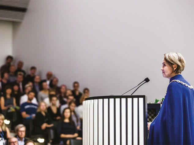 ”Autonomian lisäksi vahvan yliopiston edellytys on, että henkilökunnalla ja opiskelijoilla on mahdollisuus keskittyä ydintehtäviinsä. Tämän saavuttamiseksi yliopistossa on vallittava työrauha ja työhyvinvointia on vahvistettava. Itse asiassa yhteisömme hyvinvointi on niin tärkeä asia, että haluan nostaa sen uudeksi arvoksemme.”