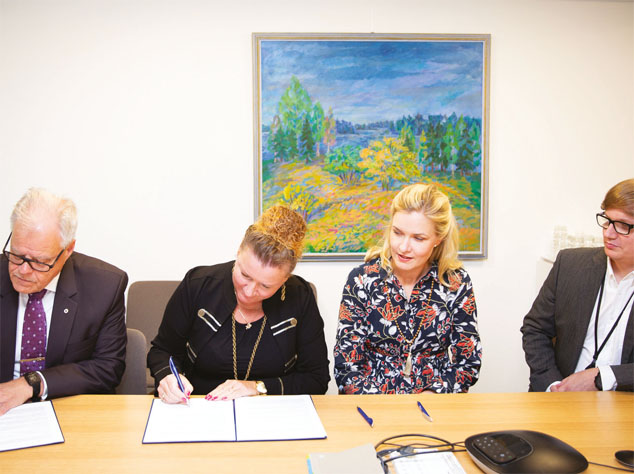 Yhteistyösopimusta allekirjoittamassa OA J:n puheenjohtaja Olli Luukkainen, Tieteentekijöiden liiton puheenjohtaja Maija S. Peltola