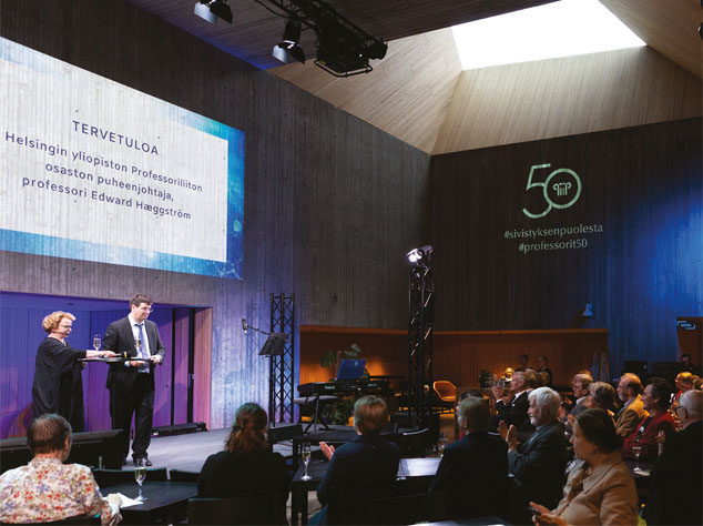 Professoriliiton Helsingin yliopiston osasto juhlisti liiton 50-vuotista taivalta Tiedekulmassa 5. syyskuuta. Lavalla osaston puheenjohtaja