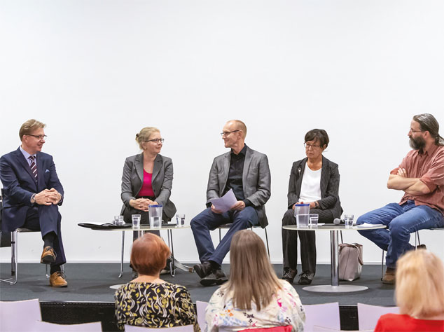 Vasemmalla paneelin puheenjohtaja Juha Räikkä, panelistit Petriina Paturi, Kari Lukka, Stina Syrjänen ja Louis Clerc.