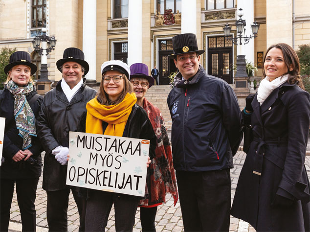 Tohtorihattupäisiä professoreita oli ensimmäistä kertaa yhdessä opiskelijoiden kanssa Säätytalon edustalla muistuttamassa budjettiriiheen meneviä ministereitä korkeakoulutuksen ja tutkimuksen rahoituksen tärkeydestä. Vasemmalla Professoriliiton järjestöpäällikkö Raija Pyykkö, professori Per Saris, puheenjohtaja Sanni Lehtinen (SYL), professori Jaana