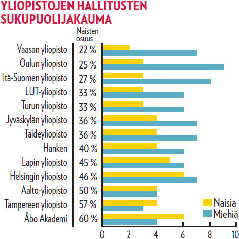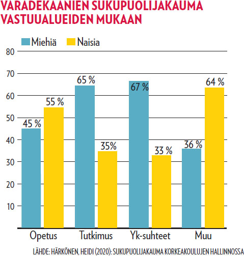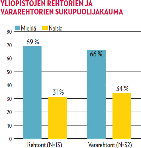 Naiset ovat edelleen aliedustettuja yliopistojen ja tiedekuntien johdossa. Rehtoreista miehiä on 69 prosenttia, vararehtoreista 66, dekaaneista 60 ja hallitusten jäsenistä 61 prosenttia. Tiedot selviävät tutkijatohtori Heidi Härkösen Akava Works -ajatuspajalle tekemästä selvityksestä.