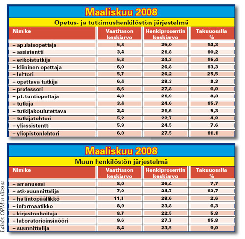 Tilastotiedot paljastavat ongelmia palkkausjärjestelmän toimivuudessaYliopistojen uusi palkkausjärjestelmä on nyt ollut voimassa reilut kaksi vuotta. Keskustelu palkkausjärjestelmästä on laantunut, kun huomio on kiinnittynyt yliopistouudistukseen. Tilastotietojen analyysi osoittaa ongelmia palkkausjärjestelmän toimivuudessa. Jotkut ovat jopa iloinneet siitä, että palkkausjärjestelmästä päästään eroon, kun yliopistouudistus tulee. Muuntyyppisestä järjestelmästä ei kuitenkaan ole aloitettu neuvotteluja. Järjestöt ovat saaneet tilastoja palkkauksesta yliopistoittain siten, että viimeisimmät tiedot ovat maaliskuulta 2008. Vastaavia tietoja on myös aiemmilta vuosilta. Tietoja on saatu myös vaativuustasoittain, nimikkeittäin, sukupuolen mukaan ja koulutustasoittain. Toimiiko järjestelmä? Onko palkkausjärjestelmä ollut oikeudenmukainen ja kannustava, kuten on luvattu? Raha ja entiset palkat ohjasivat pitkälti vaativuustasosijoittelua, kun vaativuustasot oli hinnoiteltu. Jos tehtävä tuli sijoitettua rahan puutteen takia liian alhaiselle vaativuustasolle, on korjausta vaikea saada. Vaativuustason muutoksen edellytyksenä on, että tehtävän on täytynyt vaativoitua. Muutosta alun perin väärin sijoitellulle tehtävälle on vaikea saada. Arviointiryhmien työ Palkkausjärjestelmää on väitetty byrokraattiseksi. Tämä pitääkin osittain paikkansa. Jos työntekijä haluaa vaativuustasoonsa korjauksen, on se monen portaan takana. Arviointiryhmät tekevät suuren työn käydessään läpi uusien ja muuttuneiden tehtävien vaativuudet. Arvioitavien tehtävien määrä on niin suuri, että arviointiryhmät ovat joutuneet tekemään linjauksia, jotka ovat pitkälti nimikepohjaisia. Arvioinnin pohjana pitäisi kuitenkin aina olla tehtävän vaativuus eikä nimike. Takuupalkkaiset Kun järjestelmä otettiin käyttöön, jäi muutamissa ryhmissä suuria määriä henkilöitä takuupalkalle. Tällaisia ryhmiä olivat opetus- ja tutkimushenkilöstön järjestelmässä muun muassa lehtorit ja tutkijat. Takuupalkkaisten määrät ovat vähentyneet sitten vuoden 2006. Yleiskorotukset ovat korjanneet jonkin verran tilannetta. Tutkijoiden kohdalla henkilöstön vaihtuvuus on niin suurta, että takuupalkkaisten määrä on myös sen takia pienentynyt. Varsinaista palkkojen liukumaa ylöspäin ei ole juurikaan tapahtunut, jos tarkastellaan vaativuustasojen ja henkilökohtaisen suoriutumistason keskiarvoja. Esimerkiksi tutkijoiden vaativuustason keskiarvo on ollut 3,4 vuodesta 2006 lähtien ja henkiprosentin keskiarvo on vuonna 2008 alempi kuin se oli vuonna 2006. Lehtoreiden vaativuustason keskiarvo on ollut 5,7 vuodesta 2006 lähtien ja henkiprosentin keskiarvo on nyt vähän alempi kuin vuonna 2006. Vastaava tilanne on useiden nimikkeiden kohdalla. Yliopistokohtaiset erot Suurimpien ryhmien kohdalla voidaan tarkastella myös yliopistokohtaisia eroja. Useimmat erot noudattavat aikaisempaa palkkojen erilaisuutta. Esimerkiksi lehtoreiden kohdalla maaliskuun 2008 tietojen mukaan vaatitason keskiarvo Jyväskylän yliopistossa on 5,6 ja Turun yliopistossa 6,1. Assistenttien kohdalla vaatitason keskiarvo Oulun yliopistossa on 2,8 ja Turun yliopistossa 4,2. Yliassistenttien kohdalla vaatitason keskiarvo Oulun yliopistossa on 5,6 ja Kuopion yliopistossa 6,2. Professoreiden kohdalla vaatitason keskiarvo Lapin yliopistossa on 8,2 ja Helsingin yliopistossa 8,7.