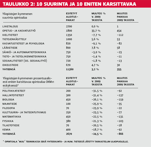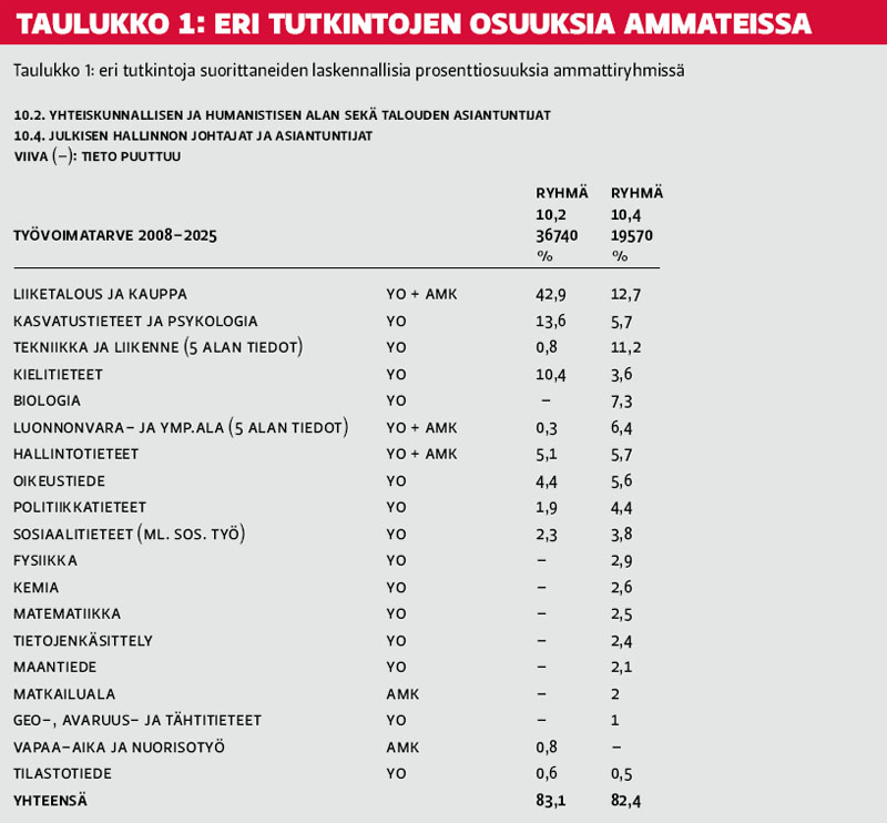 Esitys aloituspaikoista ja työvoimatarve eivät kohtaaOpetus- ja kulttuuriministeriö esittää leikkauksia perustieteiden koulutusmääriin, vaikka niitä lähellä olevissa ammateissa työvoiman kysynnän ennustettaisiin kasvavan. Soveltavien ja ammattiorientoituneiden suurten koulutusalojen sisäänotto ei juuri muutu, vaikka niitä lähellä olevissa ammateissa kysynnän ennustettaisiin laskevan. Laskennallinen tasapaino saavutetaan säätämällä koulutuksen ja ammattien vastaavuusavaimia, joiden sisältöjä ei julkisteta. Seurauksena perustieteistä valmistuneiden osuus eri ammattiryhmissä laskee ja perustutkimuksen edellytykset yliopistoissa voivat kaventua. Tavoitteena selkeä työnjako Opetus- ja kulttuuriministeriön huhtikuussa julkistama raportti Tasapainoiseen työllisyyskehitykseen 2025 sisälsi yksityiskohtaisen ehdotuksen koulutuksen mitoittamisesta opintoaloittain ja koulutusasteittain. Samat luvut löytyvät syyskuussa lausuntokierrokselle lähteneestä Koulutuksen ja tutkimuksen kehittämissuunnitelmasta vuosille 2011—16. Kesäkuussa Suomen yliopistot UNIFI ry käynnisti oman rakenteellisen kehittämisen hankkeensa, jolla pyritään selkeyttämään yliopistokoulutuksen työnjakoa ja profiloitumista, samalla varmistaen ettei miltään koulutusalalta häviä tieteenaloja eivätkä ne tule liian ohuelti katetuiksi. Hanketta varten perustettiin työryhmät — vetäjinään professorit Maria-Liisa Nevala, Jorma Sipilä, Matti Uusitupa ja Raija Sollamo — humanistiselle, kasvatustieteelliselle (opettajankoulutus pois lukien), luonnontieteelliselle ja yhteiskuntatieteelliselle koulutusalalle, joille esitetään suurimpia vähennyksiä. Teknistieteelliselle, kauppatieteelliselle ja taideteolliselle alalle ryhmiä ei perustettu, mitä selittänee taideyliopistohankkeen erityistilanne ja se, että esitetyt muutokset näille aloille ovat pieniä. Tekniikan alalle ehdotetaan 32 aloittajapaikan vähennystä (0,8 % paikoista) ja kauppatieteeseen yhden paikan lisäystä, jolloin paikkoja olisi vuosittain jaossa 2 700. Ehdotetut muutokset ovat jo olleet jonkin verran esillä, mutta vähemmän huomiota on kiinnitetty lukujen sisään kirjoitettuihin tiede- ja yhteiskuntapoliittisiin tavoitteisiin. Ministeriön ehdotus ei vain mitoita koulutusmääriä työvoimatarvetta vastaavaksi, vaan linjaa myös merkittävästi eri ammateissa toimivan työvoiman koulutustaustaa. Yliopistoissa koulutusmäärien muutos vaikuttaisi tieteenalojen resursoinnin kautta tutkimuksen edellytyksiin ja tutkija- opettajien työllisyysnäkymiin. Avaimet – rakenneuudistuksen perusta Kun ministeriön esitystä aloittajapaikoista verrataan raportissa esitettyyn työvoimatarvearvioon, synnyttää tarkastelu vaikutelman ristiriitaisuuksista. Esimerkiksi UNIFI-ryhmien ulkopuolelle jätetty tekniikan ala (yliopistot ja amk) tuottaisi vuosina 2008—25 67 000 tutkintoa, kun koulutusta lähinnä vastaavan teollisen työn asiantuntija-ammattien työvoimatarve olisi parikymmentä tuhatta pienempi. Liiketalouden alan (yliopistot ja amk) 110 000 tutkintoa näyttäisivät nekin reippaasti ylittävän kaupan ja muun liiketalouden asiantuntijatyön tarpeen, tosin erityisesti amktutkinnon suorittaneista suuri osa työllistyy kauppiaiksi ja myyjiksi. Toisaalta esimerkiksi humanisteille ja perusyhteiskuntatieteilijöille kaavaillut pienet ja entuudestaan pienenevät koulutusmäärät eivät näytä läheskään kattavan sitä kasvavaksi arvioitua asiantuntijoiden kysyntää, jota esiintyy esimerkiksi yhteiskunnallisen ja humanistisen alan sekä talouden asiantuntijoiden ja julkisen hallinnon johtajien ja asiantuntijoiden ammattiryhmissä. Asia ei tietenkään ole yksitulkintainen, sillä korkeakoulututkinnoilla työllistytään monenlaisiin ammatteihin. Laskennallinen ratkaisu ristiriitaan ovat ammattiryhmien ja koulutuksen vastaavuusavaimet. Ne kuvastavat ministeriön näkemystä siitä, millaisilla tutkinnoilla eri ammatteihin työllistytään ja minkälaisella koulutusrakenteella tulevaan työvoimatarpeeseen vastataan. Avaimet, joita on yhteensä noin 60, määrittävät aloituspaikkaehdotusten — ja kuten näyttää — myös yliopistojen rakenteellisen kehittämisen laskennallisen perustan. Niiden laatimismenetelmä on hiljattain muuttunut harkinnanvaraista arviointia ja ennakointia korostavaksi, joten niiden sisällössä korostuu valmisteluun osallistuneiden virkamiesten ja intressiryhmien koulutustahto. Avainten ohjaava vaikutus on suuri: muutaman prosenttiyksikön muutos parissa opintoalan kannalta keskeisessä avaimessa voi suuruusluokaltaan vastata useampaa yliopistollista koulutusohjelmaa. Vielä joitakin vuosia sitten vanhaan, lähinnä historialliseen tietoon pohjautuneeseen laskentamalliin perustuneet avaimet painettiin opetushallituksen raporttien liitteiksi. Enää tällaista julkisuutta ei ole, sillä ainakaan OKM:n huhtikuun raportissa avaimia ei julkaistu, eikä tämän kirjoituksen tekijä ole parista pyynnöstä huolimatta saanut nähdäkseen kuin yhden opintoalakohtaisen avaimen. Jos vertailua vanhoihin avaimiin ja historiatietoon ei voida tehdä, on muiden kuin avainten laatijan hyvin vaikea tietää, kuinka merkittävää ammattipätevyyksien uudelleenmäärittelyä ministeriö ja hallitus todella tavoittelevat. Supistuksia perustieteisiin Likimääräisen kuvan tavoitteista voi kuitenkin rakentaa yhdistämällä ministeriön tavoitteen eri opintoaloilla suoritetuista työelämään siirtyvistä tutkinnoista ja opetushallituksen näkemyksen tutkinnon suorittaneiden työllistymisestä eri ammattiryhmiin (Koulutus ja työvoiman kysyntä 2020, OPH 2009, s. 129—198). Näin muodostetut taulukot eivät ole varsinaisia avaimia, vaan ministeriössä tapahtuneen poliittisen tarkastelun huomioivia laskelmia ammattiryhmien tavoitteellisista koulutusrakenteista. Taulukossa 1 tehdään kahteen ammattiryhmään, 10.2 Yhteiskunnallisen ja humanistisen alan sekä talouden asiantuntijat sekä 10.4 Julkisen ha