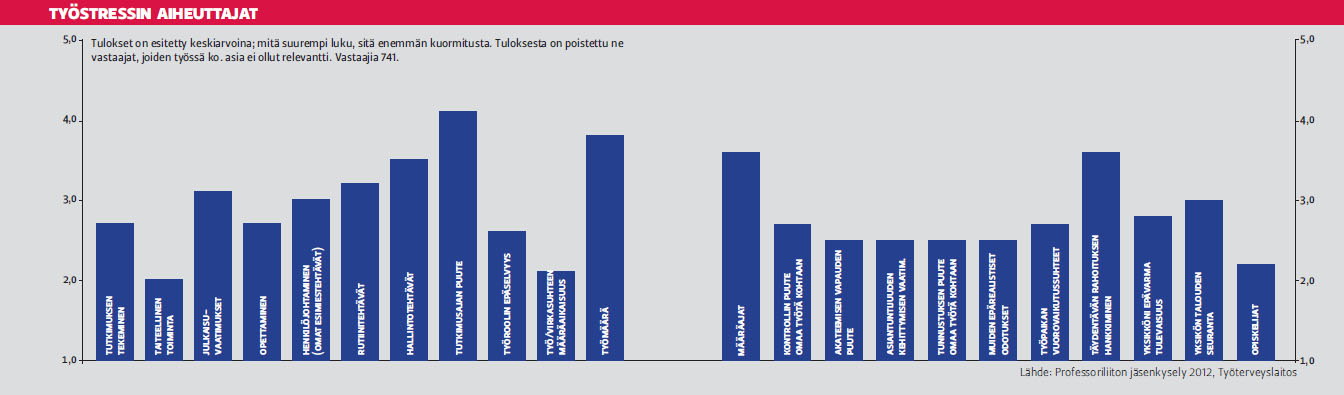 Jäsenkysely: Professori tekee liikaa töitä – ilollaProfessori paiskii ylipitkää työpäivää, mutta tuntee työniloa. Vaikutusmahdollisuudet omaan työhön ovat hyvät, mutta toisaalta yliopiston sisällä professori tuntee, ettei häntä kuunnella tarpeeksi. Avustavasta henkilöstöstä on huutava pula. Professoriliitto teki viime keväänä yhdessä Työterveyslaitoksen kanssa jäsenkyselyn, joka keskittyi professorien työoloihin, työn resursointiin ja hyvinvointiin. Vastausprosentti oli hyvä — 47 — eli kaikkiaan 741 liiton jäsentä vastasi. Johtotehtävissä toimivia professoreita vastaajista oli kaksi kolmasosaa. Kyselyn toteuttaneet Työterveyslaitoksen tutkijat olivat ihmeissään tuloksista, jotka liittyvät professorien työaikaan. Vastaajista 38 prosenttia tekee töitä 2000—2600 tuntia vuodessa, kun kokonaistyöaika on 1600 tuntia. Normaalia työpäivää teki 26 prosenttia, lievää ylityötä 43 prosenttia ja ylipitkää työpäivää 31 prosenttia professoreista. Työterveyslaitos määrittelee yli 10 tunnin työpäivän ylipitkäksi. Työterveyslaitoksen tutkija Jenni Ervasti: Miten näin pitkä työpäivä voi vaikuttaa ihmisen terveyteen? — Yli 10 tunnin työpäivien on Lontoon yliopiston ja Työterveyslaitoksen tutkimuksissa todettu vaikuttavan kielteisesti kognitiiviseen suorituskykyyn ja lisäävän riskiä masennukseen, unihäiriöihin ja sydäntauteihin Stressioireita koki melko tai erittäin usein 36 prosenttia vastaajista. Nuoremmilla ja vähemmän aikaa professoreina toimivilla oli enemmän näitä oireita kuin vanhemmilla ja kauemmin töissä olleilla. Sukupuolella ja esimiesasemalla ei ollut yhteyttä stressin kokemiseen. Jenni Ervasti: Onko professoreilla stressiä enemmän kuin muulla yliopistohenkilöstöllä? — Stressioireiden kokeminen näyttäisi todella olevan yleisempää professoreilla kuin muulla yliopistohenkilöstöllä tai työssäkäyvillä yleensä. Työterveyslaitoksen Työ ja Terveys Suomessa 2009 -tutkimuksessa 8 prosenttia työssäkäyvistä koki melko tai erittäin paljon stressiä. Vuonna 2009 kahdessa suomalaisessa yliopistossa toteutetussa tutkimuksessa (Elo ym. 2009) 26 prosenttia vastaajista (opetus-, tutkimus-, tuki-, hallinto- ja toimistohenkilökunta) koki melko tai erittäin paljon stressiä, kun vastaava osuus tässä tutkimuksessa oli tuo 36 prosenttia. Tutkimusajan puute stressaaKyselyssä tiedusteltiin myös professorin työajan jakautumista erilaisiin tehtäviin. Perustutkintokoulutukseen vierähtää 30 prosenttia, tutkimukseen vajaa neljännes, esimiestyöhön ja johtamiseen 16 prosenttia työajasta. Professorit kokevat tutkimusajan puutteen selvästi suurimmaksi yksittäiseksi työstressin aiheuttajaksi. Täydentävän rahoituksen hankkiminen, työmäärä ja määräajat tulevat seuraavina. Opettaminen tuottaa stressiä harvoille. Professoriliiton puheenjohtaja Maarit Valo: Miten tutkimusajan riittämättömyys näkyy professorin työssä? — Tutkimustyö on luovaa ajattelutyötä. Päivät ja viikot ovat pirstaloituneita muuhun työhön, eikä tunti siellä ja toinen täällä mahdollista riittävää keskittymistä. Moni professori käyttääkin viikonloppunsa ja kesälomansa tutkimiseen ja hankesuunnitteluun. Erityisesti kirjoitustyö vaatii paneutumista. Niinpä professorin työ on liian usein vuorotyötä: päivävuoron jälkeen alkaa iltavuoro. Avustavaa henkilöstöä lisää Vastaajilta kysyttiin myös työn resursointiin liittyviä asioita. Selvästi eniten puutetta on tutkimusta avustavasta henkilöstöstä. Aalto-yliopisto erottui muista suurista yliopistoista siten, että siellä oltiin keskimääräistä tyytyväisempiä avustavan henkilöstön määrää kuin muissa suuremmissa yliopistoissa. Tieteenaloittain tarkasteltuna tekniikan ja luonnontieteen puolella on avustavaa väkeä enemmän kuin esimerkiksi humanistisissa ja yhteiskuntatieteissä. Muut työskentelyolosuhteet ovat vastausten valossa melko hyvässä kunnossa. Jopa tietojärjestelmät on ilmeisesti saatu yliopistoissa aiempaa paremmalle tolalle. Professorit olivat tyytyväisiä etenkin kirjastopalveluihin ja opetustiloihin. Helsingin yliopistossa professorit pitivät opetustiloistaan enemmän kuin Aallossa. Ulkomaisiin konferensseihin pääsee parhaiten osallistumaan tekniikassa ja heikoimmin humanistisissa sekä maatalous- ja metsätieteissä. Aalto-yliopistossa on selvästi helpompaa päästä ulkomaille kuin esimerkiksi Itä-Suomen ja Turun yliopistoissa. Professorin mielipidettä ei kysytäProfessorit kokevat lähityöyhteisönsä melko toimivaksi. Miesten arviot ovat naisvastaajia myönteisempiä. Myös lähiesimiehen toimintaan ollaan suhteellisen tyytyväisiä. Kyselyssä tiedusteltiin myös vaikutusmahdollisuuksia organisaatiossa ja toisaalta omassa työssä. Vastausten perusteella professorit kokevat, ettei yliopiston ylin taso ole riittävästi kiinnostunut heidän työstään. Tietoa ei saa riittävästi, eikä ainakaan ajoissa. Professorin mielipidettä ei kysytä eikä hänen osaamistaan tarvita isoissa strategisissa päätöksissä. Liiton puheenjohtaja Maarit Valo: Ovatko vaikutusmahdollisuudet vähentyneet yliopistouudistuksen myötä? — Yliopistouudistuksen yhteydessä kollegiaalinen johtaminen väheni selvästi. Nyt entistä harvempi professori on mukana suunnittelemassa suuria linjoja tai päättämässä niistä. Moni kysyy, pääseekö ylin tieteellinen asiantuntemus enää kunnolla näkyviin yliopiston kauaskantoisissa strategisissa päätöksissä. Nimenomaan valmisteluvaihe tapahtuu nyt aikalailla näkymättömissä. Sen sijaan vaikutusmahdollisuus omaan työhön, nimenomaan sen sisältöön näyttää säilyneen hyvällä tolalla. Professori voi edelleen vaikuttaa hyvin siihen, mitä hän tutkii ja opettaa. Mutta työmäärään ja omaa työtä koskevaan tärkeisiin päätöksiin on hankalampaa puuttua. Miehet kokevat vaikuttamisen helpommaksi kuin naiset. Iloa merkittävästä työstäStressioireist