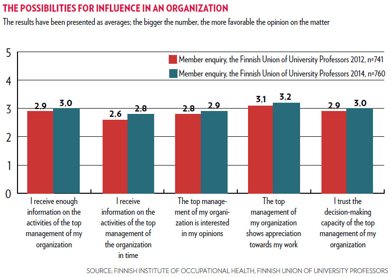 Professorial Work is Becoming Increasingly ScatteredThe work of professors is interrupted more often and for longer periods of time than the work of other specialists. Continuous organizational changes are a menace in universities as well as other research institutes. Last spring, the Finnish Union of University Professors and the Finnish Institute of Occupational Health conducted a joint member enquiry, which concentrated on the working conditions of professors, resourcing of the work and general wellfare. The percentage of those who answered was 48%, which is higher than the average percentage of answers in these kinds of enquires. The amount of those who answered was slightly higher than in the corresponding member enquiry from the year 2012. You can influence your own work, but you have less influence on the organization as a whole The functionality of the closest work community has increased slightly in two years. Could it be that the turmoil caused by the University reform is calming down? Especially the flow of information within the work commmunity shows signs of positive development. There is also ever so slightly positive change of direction concerning the compiling of the common rules of the game and the encouraging working athmosphere. 71% of the professors who answered the enquiry have managerial duties or are otherwise in the position of leadership. Professors have superiors, too. Assessments concerning the undertakings of the immediate superior have not changed in two years. The popularity of performance appraisals has gone down after the corresponding enquiry of the year 2012. The possibilities of influencing personal work were considered to be significantly better than the possibilities of influencing the functioning of the organization as a whole. There has been positive development, however: the estimates of the professors on the possibilities of having influence on their organizations were better than two years ago. Those respondents who reported that they belong to the board of their university naturally had better estimates of their possibilities to influence. Membership in the governing bodies was, however, not always a quarantee for better chances to influence: the members of the University Collegiate Council, Academic Council or Department Council did not feel that they had in any way better chances to influence than those who do not belong to these bodies. In light of the results from the enquiry, top management is still relatively unconcerned about the opinions of professors. The assertion ”I receive information on the activities of the top management in time” did not get high numbers (on a scale of 1—5, the average was 2,8). Two years ago the corresponding number was 2,6, so there evidently has been some betterment in the flow of information. Assisting personnel has vanished The shortage of assisting personnel is as alarming as it was two years ago. This was emphasized especially in the open answers, of which there were plenty — over 400. Assisting personnel in universities has been cut down and the remaining personnel has moved to a distance from the departmental community. The chair of the Finnish Union of University Professors, Maarit Valo, approaches this problem in her text in Professoriblogi, ”Professors as Office Clerks” (Professorit toimistoapulaisina), and the dissemination of the blog in social media has brought this problem more into public awareness and discussion. One professor from the University of Turku had the following comment on the situation, delivered in an open answer: ”Office secretaries, for instance, have been moved from the operational units into administrative service units. Simultaneously, for example duties concerning financial administration have multiplied in the units, which has led to a situation, in which teachers/reseachers/technical personnel performs the duties of office secretaries alongside their own duties. I am the chair of our unit, but despite this I perform daily the duties that office secretaries used to do. University reform has resulted in a situation, where the productive personnel serves the administration, and not vice versa.” Although the profit responsibility of units is on the increase, professors with management duties still do not receive the necessary amount of information concerning finances. The attitude towards the claim that ”I have at my disposal the necessary information for the following of financial matters in my position as director/head of my unit” shows a slightly favourable turn during the past two years, but there is still need for improvement. — The means for management have improved slightly. There is still room for improvement, however, when only slightly under 40% of those working in managerial duties report that they have the information on economic monitoring at their disposal, Jenni Ervasti, the senior researcher of the Finnish Institute of Occupational Health, points out. The work is more and more frequently interrupted The professors estimate that their weekly working hours add up to 51 on average. This is almost ten hours more than with people doing knowledge-related work on average. The professors report a large amount of interruptions that disturb their work (80%). This is more than in the previous enquiry. Especially large amount of interruptions was reported by women, young academics and those who are in a managerial position. Among factors influencing working conditions, the opacity of data systems, programs and the equipment manuals, as well as trying to perform too many things at the same time and moving between different tasks, were among the reasons for continuous interruptions. It also seems that there are more interruptions than with experts on average. In the data from the Better Working Community (Parempi Työyhteisö) enquiry of the Finnish Institute of Occupational Health, 60% of the respondents working as specialists claim that interruptions occ
