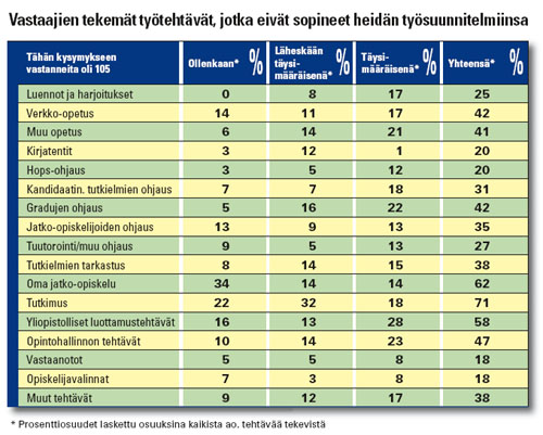 Ei työ tekemällä lopuTunnolliset ja työhönsä sitoutuneet opettajat kantavat huolta opiskelijoistaan, oppiaineistaan ja yliopistoistaan rajoittamatta työaikojaan 1600 tunnin vuositasoon. Yliopistonlehtorien liiton tekemä alustava kartoitus tukee tätä väitettä. Syyskuussa 2008 lähetettiin Helsingin ja Jyväskylän yliopistojen sekä Tampereen teknillisen yliopiston YLL:n jäsenille heidän työkuvaansa kartoittava nettikysely. Lyhyestä vastausajasta johtuvan vastausprosentin alhaisuudesta (22 %, 107) huolimatta tulokset tarjoavat hyvän läpileikkauksen Suomen yliopistojen opetuspainotteisten virkojen tehtävien sisällöstä ja muutoksista. Mitä työsuunnitelmat sisälsivät? Monimuotoistunut opetus ja lisääntynyt ohjaus veivät pääosan vastanneiden työsuunnitelman mukaisesta 1600 h kokonaistyöajasta. Perinteisen luento- ja harjoitustyöopetuksen lisäksi puolella vastaajista työsuunnitelmiin sisältyi verkko-opetusta, kirjatenttejä sekä tutkielmien tarkastamista. Kolmella neljästä vastaajasta työsuunnitelmiin sisältyi myös muita opetustehtäviä. Moniin työsuunnitelmiin sisältyi pieniä tuntimääriä ohjausta (hops-ohjausta 43 %:lla vastaajista, tuutorointia 41 %:lla, kandidaatin tutkielmien ohjausta 34 %:lla, gradujen ohjausta 45 %:lla ja jatko-opiskelijoiden ohjausta 22 %:lla). Tutkielmien ohjausta ja tarkistamista työsuunnitelmat sisälsivät pienimmillään 0.5 h/opiskelija. Tutkimusta sisältyi jonkin verran (tyypillisin arvo 31- 100 h) kahteen kolmesta työsuunnitelmasta ja omaa jatko-opiskelua pienessä määrin (tyypillisin arvo 1 - 30 h) lähes joka kolmanteen työsuunnitelmaan. Hallinnollisia sekä muita tehtäviä kuului valtaosaan työsuunnitelmia (yliopistollisia luottamustehtäviä 61 %:lla vastaajista, opintohallinnon tehtäviä 64 %:lla, vastaanottoja 87 %:lla, opiskelijavalinnan tehtäviä 51 %:lla ja muita sekalaisia tehtäviä 79 %:lla). Mitä työsuunnitelmiin ei mahtunut? Työsuunnitelmat kertovat, mitä tehtäviä töihin pääosin sisältyi, mutta eivät, miten paljon eri tehtäviä todellisuudessa tehtiin. Hälyttävää oli monien työtehtävien jääminen osittain tai jopa kokonaan työsuunnitelman ulkopuolelle (ks. taulukko s. 28). Opetus- ja ohjaustehtävien lisäksi vastaajat hoitivat opintohallinnolliset tehtävät ja yliopistolliset luottamustehtävät sekä muut tehtävät riippumatta siitä, sopivatko tehtävät kokonaistyöaikaan. Kaikista vastaajista 70 % teki tutkimusta, mutta lähes kolmella neljästä tutkimusta tehneistä se jäi kokonaan tai osittain työsuunnitelman mukaisen työajan ulkopuolelle. Kaikista vastaajista 21 % tekisi tutkimusta, jos sen tekeminen sopisi työsuunnitelmaan. Miten vastaajien työtehtävät olivat muuttuneet? Vastaajien kertomat työtehtävien muutokset heijastelivat yksilöllisiä mutta myös yleisiä työnkuvan muutoksia sekä yleistä työmäärän kasvua. Vastaajien kaikista työtehtävistä kolmasosa oli säilynyt määrältään ennallaan, vajaa viidesosa vähentynyt ja puolet tehtävistä oli lisääntynyt viime vuosien aikana. Luento- ja harjoitusopetuksen määrät olivat pysyneet keskimäärin ennallaan, mutta verkko-opetuksen sekä muun opetuksen ja ohjauksen määrät olivat lisääntyneet. Eniten kuitenkin olivat lisääntyneet opintohallinnon tehtävät sekä ns. muut tehtävät. Virkaehtosopimuksen mukaiset mitoitusperusteet Yliopistojen tehtävänä on tutkimukseen perustuva opetus. Yliopiston opettajalta edellytetään entistä enemmän ja entistä yksilöllisempää opiskelijoiden ohjausta. Kontaktiopetuksen käsite odottaa päivittämistä lisääntyvän tietokoneavusteinen opetuksen myötä. Viime aikoina kaikille opettajille on siirtynyt monia opintohallinnon tehtäviä. Taideaineiden lehtoreiden työ on muuttumassa yksilöopetuksesta ryhmäopetukseksi. Virkaehtosopimuksen mukaiset kontaktiopetustuntikatot määrittävät, miten paljon opetusta voi kuhunkin tehtävään enintään sisältyä 1600 tunnin puitteissa. Esimerkiksi lehtorilla ja päätoimisella tuntiopettajalla täydet opetusvelvollisuudet tarkoittavat, että opetuksen lisäksi tehtäviin voi kuulua noin 100 h muita tehtäviä, kuten vastaanottoja, kokouksia jne. Mikäli työtehtäviin sisällytetään enemmän muita tehtäviä, esim. tutkimusta, tulee opetusvelvollisuuden vastaavasti laskea. Johtopäätökset Työnantaja on jossakin yhteydessä esittänyt opetuskattojen nostamista. Tehdyn kartoituksenkin perusteella tulee väkisin mieleen uhkakuva vielä yhdestä korresta, joka lopulta katkaisee kamelin selän. Monet viime vuosina lisääntyneet tehtävät kun olivat eniten aliresursoituja. Akavan puheenjohtaja Matti Viljasen on nostanut keskusteluun akavalaisten harmaat ylityöt: “Kustannukset ovat kovat, kun ensin tekee hullun lailla töitä ja sitten palaa loppuun”. Yliopistouudistuksen myötä täytyy pysähtyä miettimään, mihin ollaan pyrkimässä ja millä hinnalla. Yliopistojen opettajien palkkatyön teettäminen palkattomana talkootyönä on loputtava. Opetustuntikattoja on perusteltua tarkistaa, mutta alaspäin. Kaikkien vaadittavien työtehtävien tulee sisältyä täysimääräisinä työsuunnitelmiin. Ylitöiden pitäisi olla poikkeuksia ja niistä olisi maksettava korvaus. YLL:in työvaliokunta: