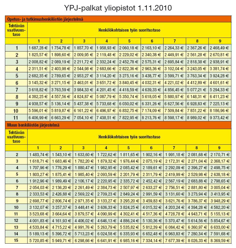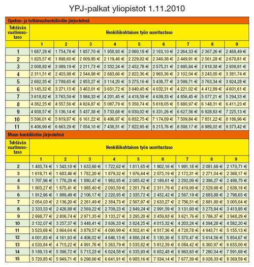 Palkankorotuksia yliopistoissa 1.11.2010 lukienTyöehtosopimukseen perustuen yliopistojen henkilöstö saa marraskuun alusta kolmenlaisia palkankorotuksia: kertaerä, yleiskorotus ja järjestelyerä. Yliopistoissa noudatettava työehtosopimus eli TES on voimassa 1.3.2010-29.2.2012. TES voidaan irtisanoa jonkin sopijaosapuolen (mm. JUKO ja Sivistystyönantajat) toimesta 28.2.2011 mennessä, jollei vuoden 2011 korotuksista päästä yksimielisyyteen. TES:n perusteella marraskuussa 2010 tulee kolmenlaisia korotuksia: 1) kertaerä, 2) yleiskorotus ja 3) järjestelyerä. Kertaerän saa, jos työsuhde on voimassa sekä loka- että marraskuussa 2010. Kertaerä suuruus on 5,5 % lokakuun palkasta. Täten esim. 2500 euron kuukausiansiolla saa 137,5 euron kertaerän. Vastaavasti esim. 6000 euron ansiolla erä on 330 euroa. Yleiskorotuksen suuruus on kaikilla marraskuun alusta lukien 0,4 %. Yleiskorotus viedään vaativuustasojen hintoihin. Sekä kertaerän että yleiskorotuksen käytännön toteuttaminen on suhteellisen yksinkertaista. TES:n mukaan marraskuun alusta tulee 0,58 %:n järjestelyerä. Mikäli erän käytöstä ei olisi sopijaosapuolten kesken päästy yhteisymmärrykseen 15.10.2010 mennessä, olisi järjestelyerä muuttunut yleiskorotukseksi. Yhteisymmärrys kuitenkin lopulta löytyi. Järjestelyerä viedään vaativuustasolukkoihin. Erän suuntaaminen ei kuitenkaan tapahdu tasaisesti eri tasoille. Mistään suuresta korotuksesta ei ole kenenkään osalta kyse. Uudet palkkataulukot ovat ohessa ja ne löytyvät myös liittojen kotisivuilta. Akatemiaprofessoreiden ja -tutkijoiden korotukset tulevat olemaan edellä kuvatun tasoisia, mutta ne tullaan toteuttamaan toisella tavalla. Vielä ei ole tarkkaa tietoa siitä, millä tavalla korotukset toteutetaan. Samanlainen on tilanne Aallon omaan palkkausjärjestelmään kuuluvan toistaiseksi vielä suppean joukon palkankorotusten osalta. Tavoitteena on, että maksuun korotukset tulevat marraskuun palkanmaksun yhteydessä. Ihan varmaa ei ole, onnistuuko tämä ainakaan kaikkialla. Mikäli korotuksia ei makseta marraskuun palkassa, tulevat ne maksuun takautuvasti. Jorma Virkkala |